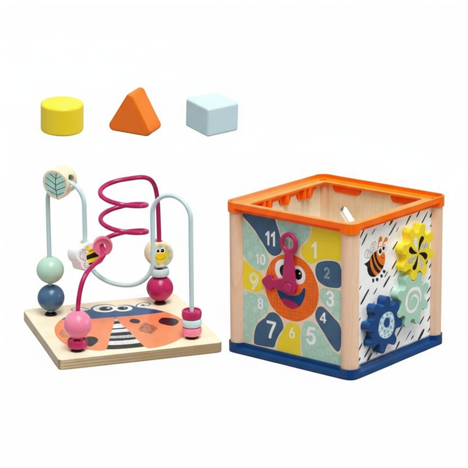 Przyciąga uwagę niemowląt i małych dzieci, zapewniając inspirującą przestrzeń do zabawy i nauki. Zawiera m.in. wyjmowany labirynt, sorter, zegar z ruchomymi wskazówkami i interaktywne koła zębate. Kostka daje maluszkom pole do eksperymentów, jednocześnie wspierając koordynację ręka-oko, wyobraźnię, kreatywność, a także rozpoznawanie kolorów i kształtów. Jest solidnie i bezpiecznie wykończona, a ilość możliwości sprawia, że dziecko odkrywa zabawkę na nowo, wraz z dalszym rozwojem.