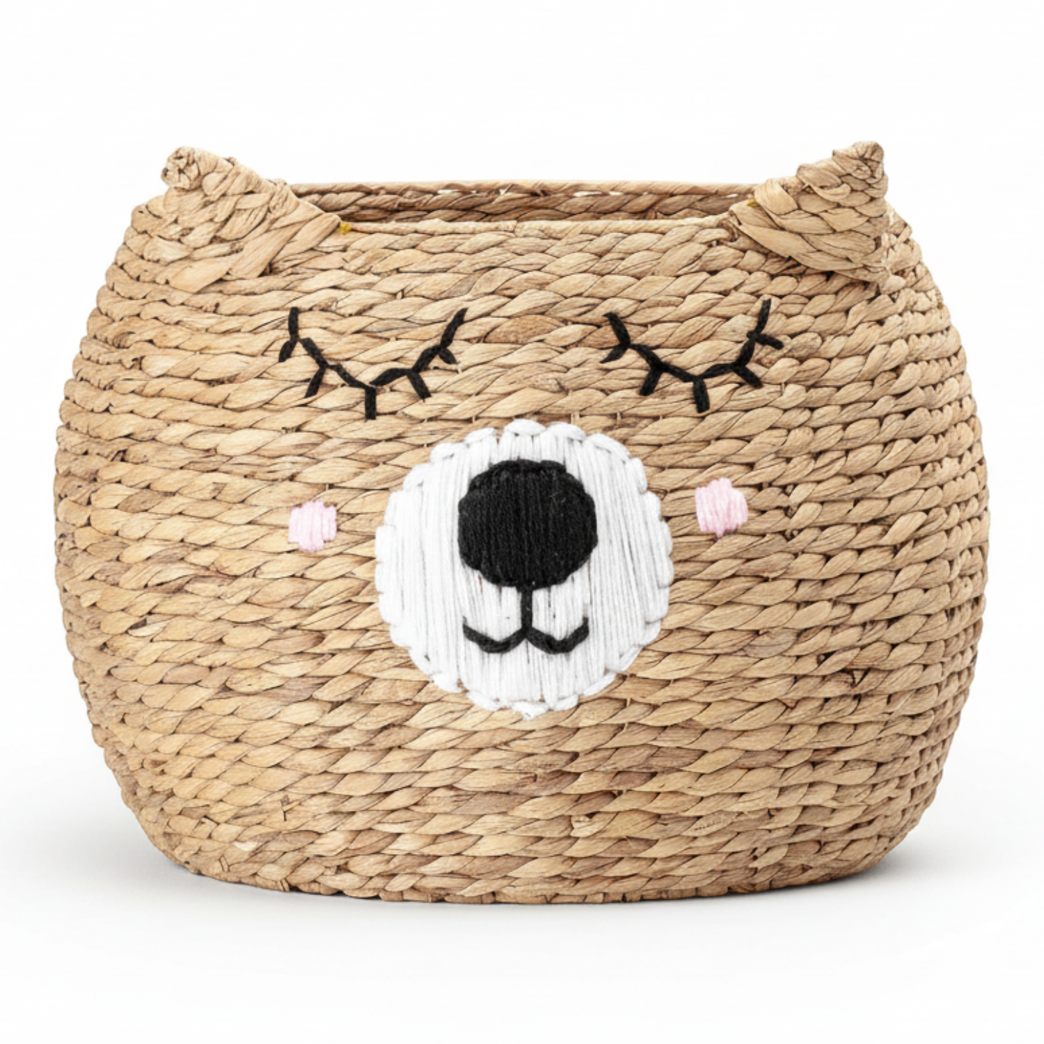 Eman to uroczy koszyk od Bloomingville MINI z małymi uszami i wyhaftowaną twarzą misia z przodu