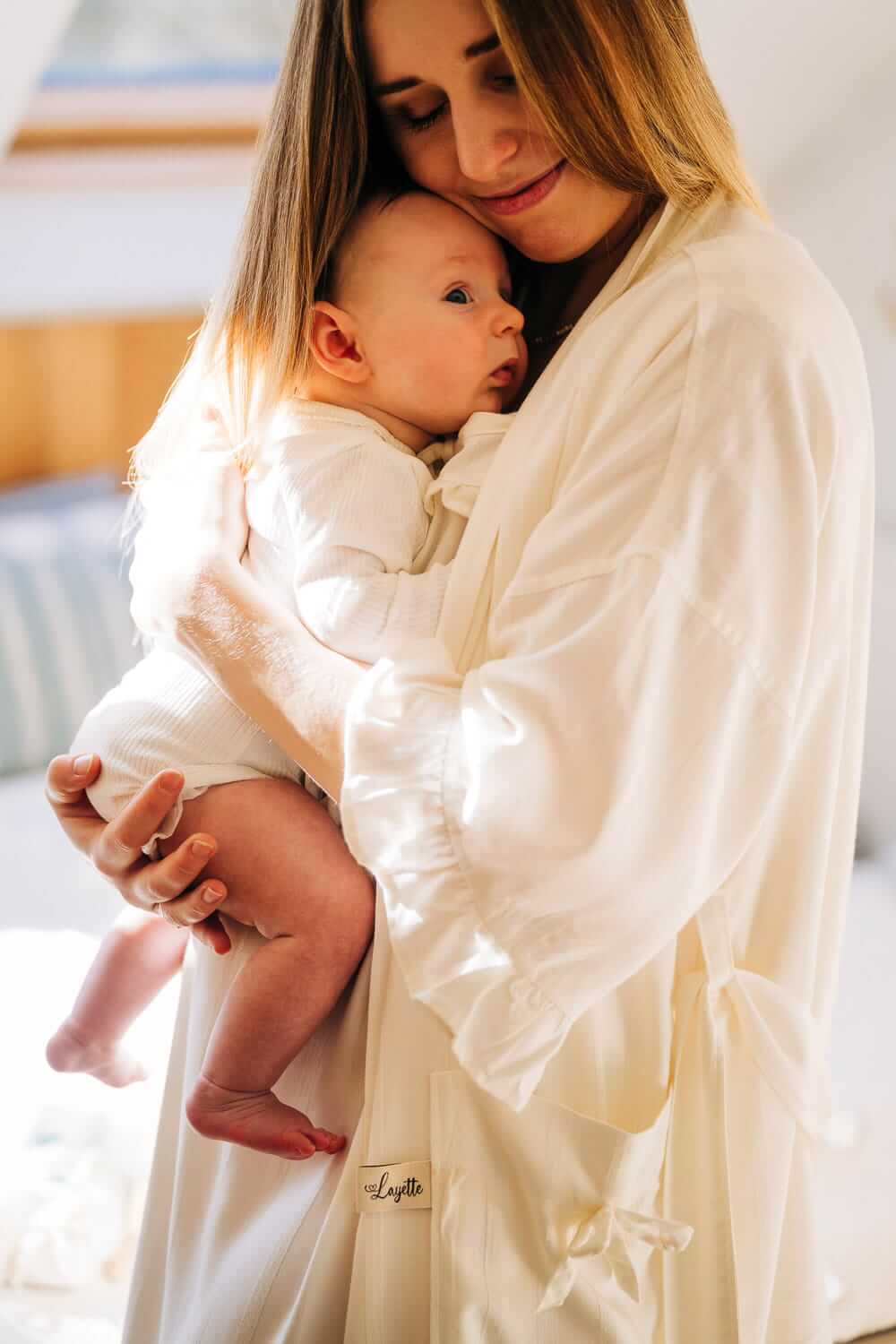 Kolekcja Romantic powstała z myślą o spokojnych, czułych chwilach z maluszkiem. Materiał zdobi subtelny, tkany wzór w postaci drobnych pionowych paseczków, który nadaje tkaninie delikatnej faktury i szlachetnego charakteru. Do tego subtelna falbanka i ponadczasowy krój tworzą miękką, kobiecą całość – zarówno w pościeli dla dziecka, jak i w koszuli oraz szlafroku dla mamy. To kolekcja, która otula nie tylko materiałem, ale też atmosferą retro i bliskości.