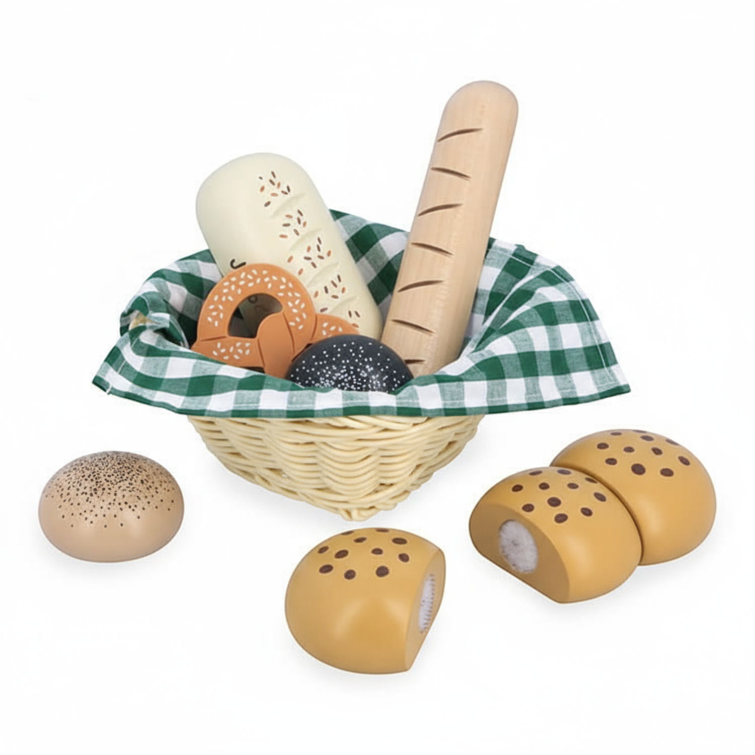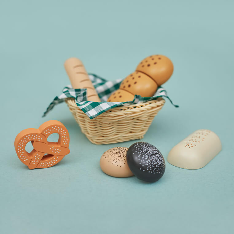Zestaw zawiera solidny pleciony koszyczek, bawełnianą kraciastą serwetkę oraz 6 różnych rodzajów pieczywa: chleb, precla, bagietkę, czarną bułkę, pszenną bułką z ziarnami oraz 3-częściową chałkę (na rzepy). Zabawkę zaprojektowano we Francji. Zapakowana jest w estetyczne, kartonowe pudełko. Idealnie nadaje się na prezent.