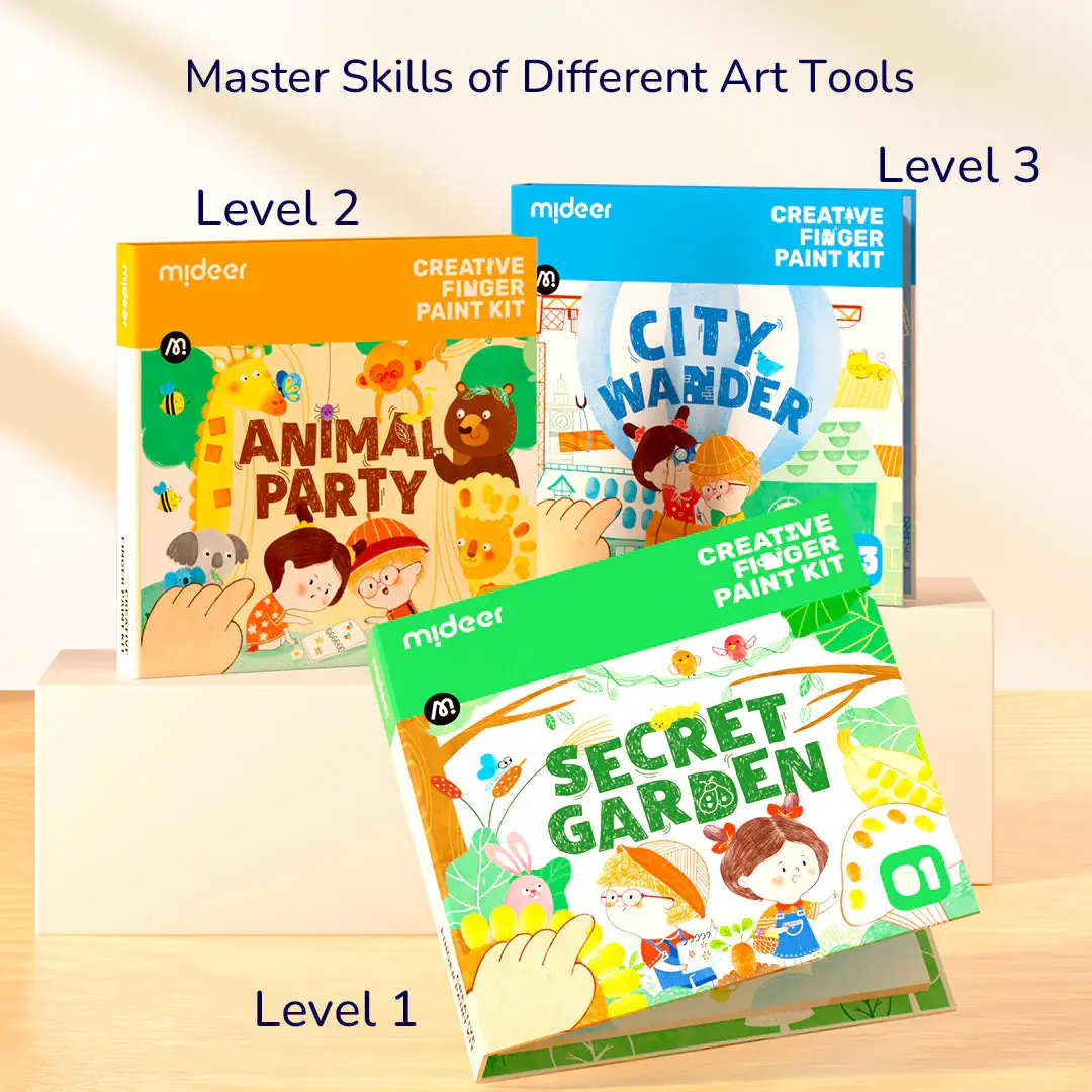 Seria do malowania palcami składa się z trzech stopniowo bardziej zaawansowanych książek, które uczą różnych technik malowania i użycia narzędzi plastycznych.