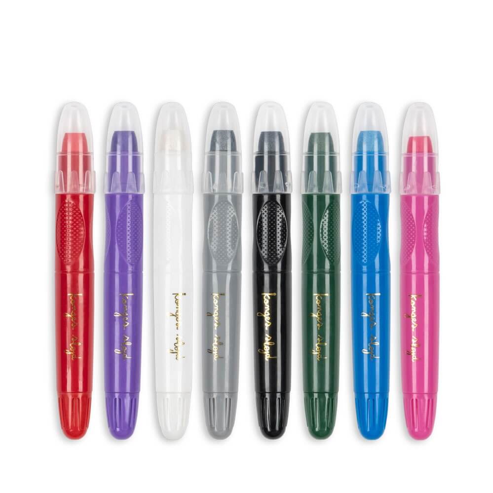 Wykonane na bazie wody, mogą być stosowane zarówno na twarzy, jak i na ciele. Kredki są wolne od perfum i glutenu, przyjazne weganom i dostępne w ośmiu pięknych, intensywnych kolorach. Wszystkie kolory łatwo zmywają się przy użyciu łagodnego mydła i letniej wody.