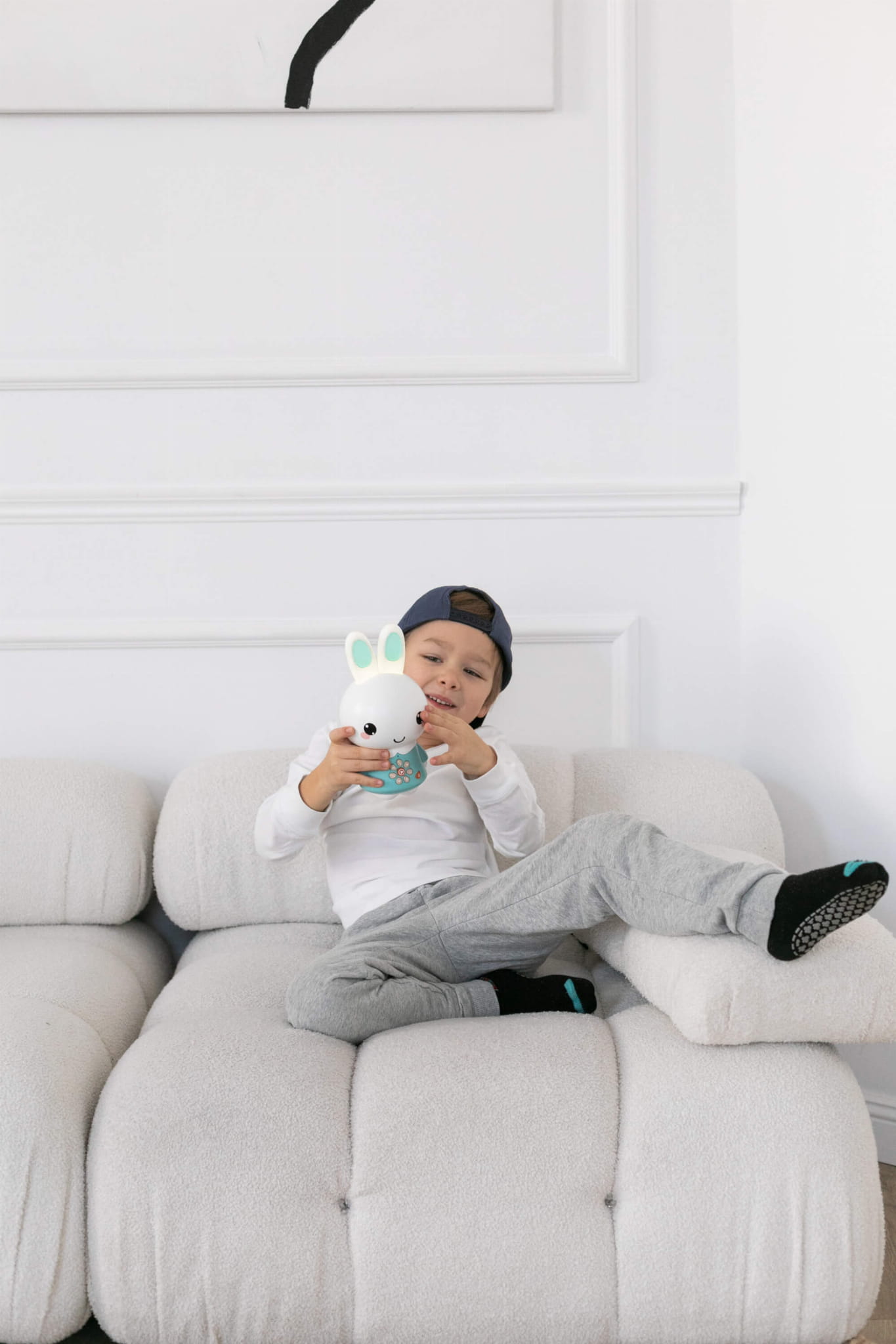 Specjalny przycisk umożliwia włączenie kolekcji kojących dźwięków, które obniżają i blokują głośność króliczka (żeby przypadkowo nie zwiększyć jej przy zasypianiu dziecka) – króliczek sam wyłączy się wtedy po 30 minutach. - Delikatne światło nocne