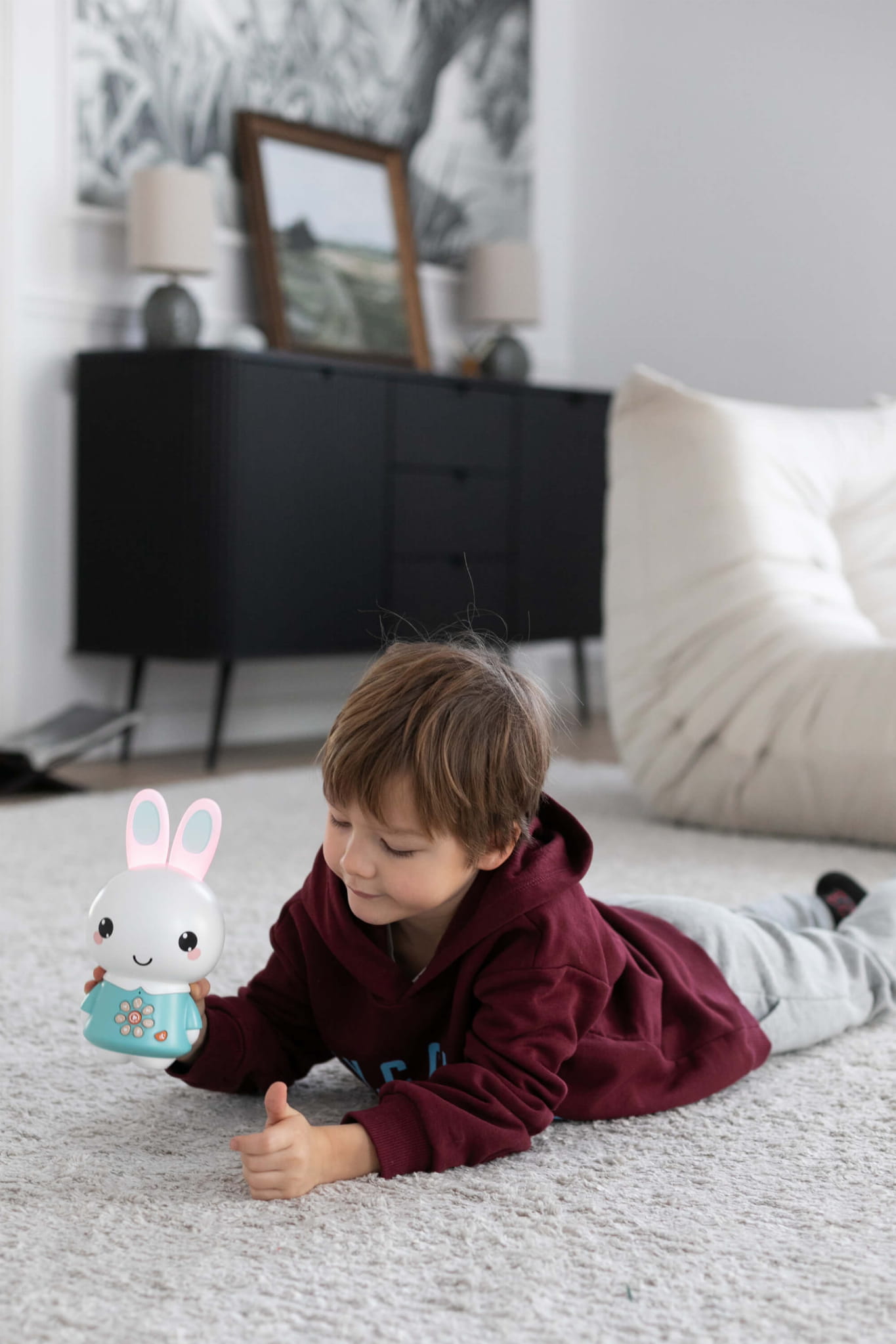 Miękkie uszy króliczka świecą delikatnym światłem zmieniającym kolory dodając otuchy przy zasypianiu. - Przyjazny środowisku i oszczędny