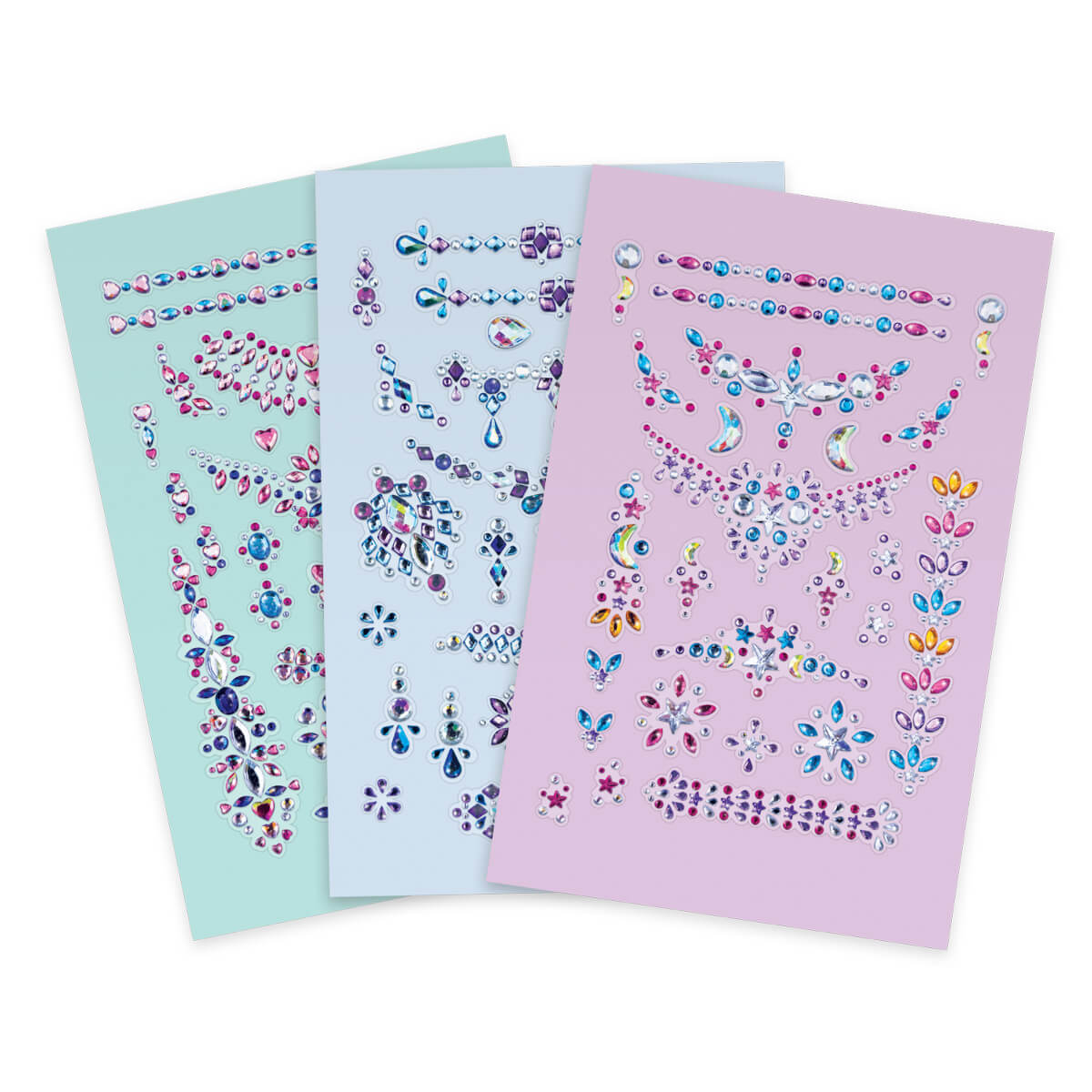 - Prosta aplikacja, zero kleju i bałaganu – Nie potrzebujesz żadnych dodatkowych produktów – wystarczy odkleić i przykleić ozdobę na wybrane miejsce. Kryształki dobrze trzymają się skóry, a po zabawie można je łatwo zdjąć.