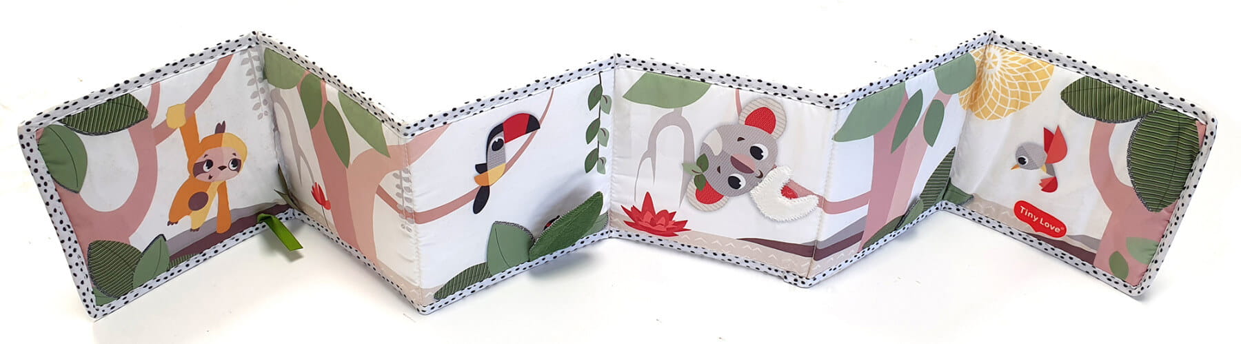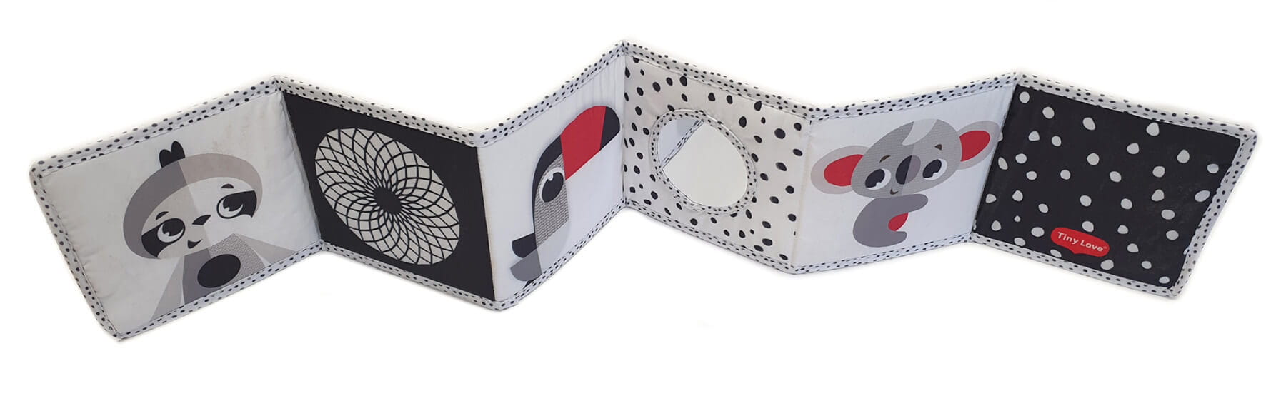 - Zmysły - kontrastująca czarno-biała strona została stworzona, aby już od narodzin wspierać wzrok dziecka. Kolorowa strona, z większą ilością detali, jest wyposażona w różnorodne elementy, które oferują stymulację zmysłu wzroku i dotyku starszego dziecka. Obie strony książeczki wspierają rozwój twojego rosnącego maluszka.