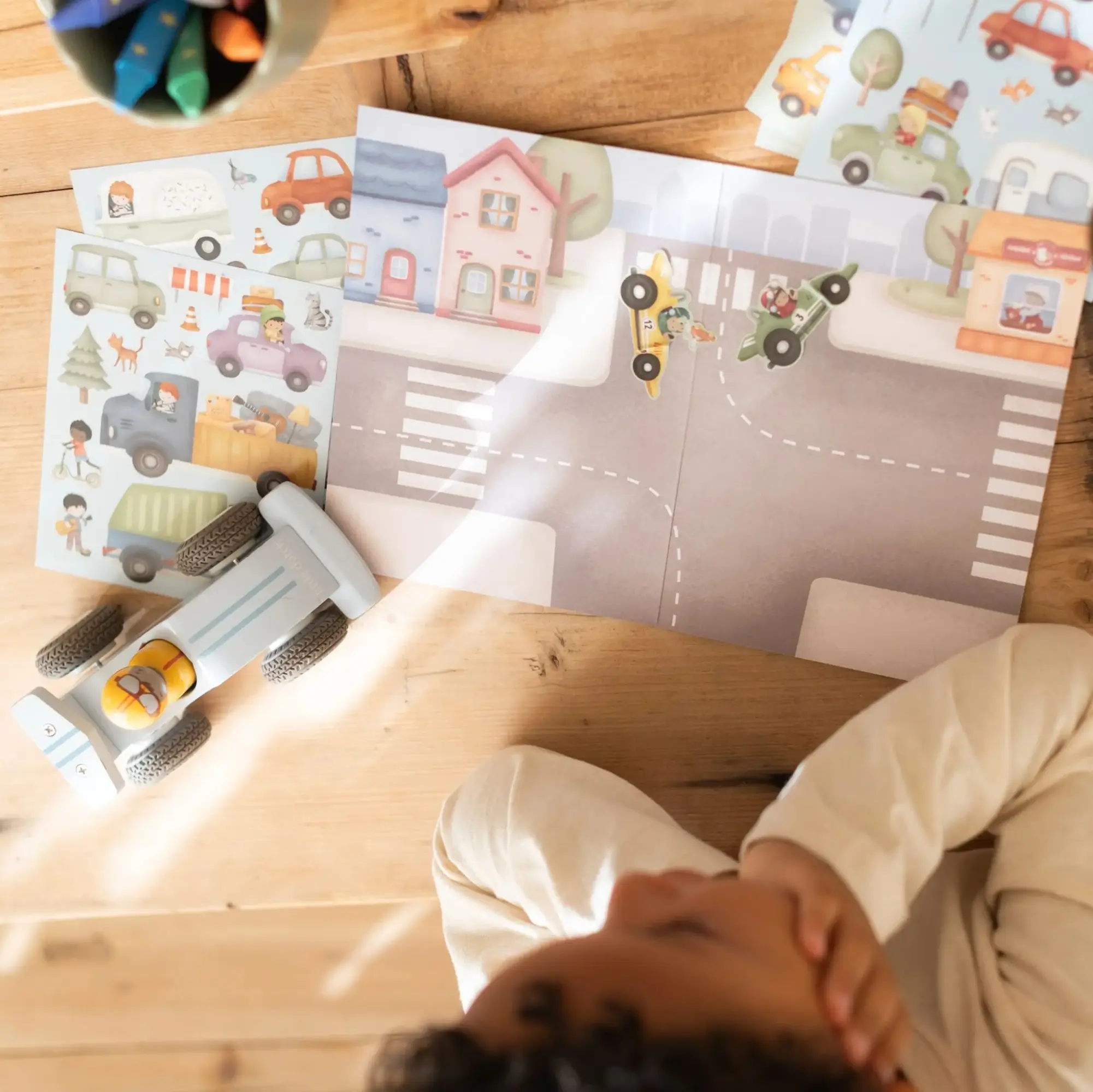 W zestawie znajdziesz 90 barwnych naklejek oraz dwustronne tło do zabawy, które pozwalają dziecku wycinać, naklejać i tworzyć niekończące się opowieści. Każda nowa kompozycja to okazja do rozwijania kreatywności i wyobraźni.