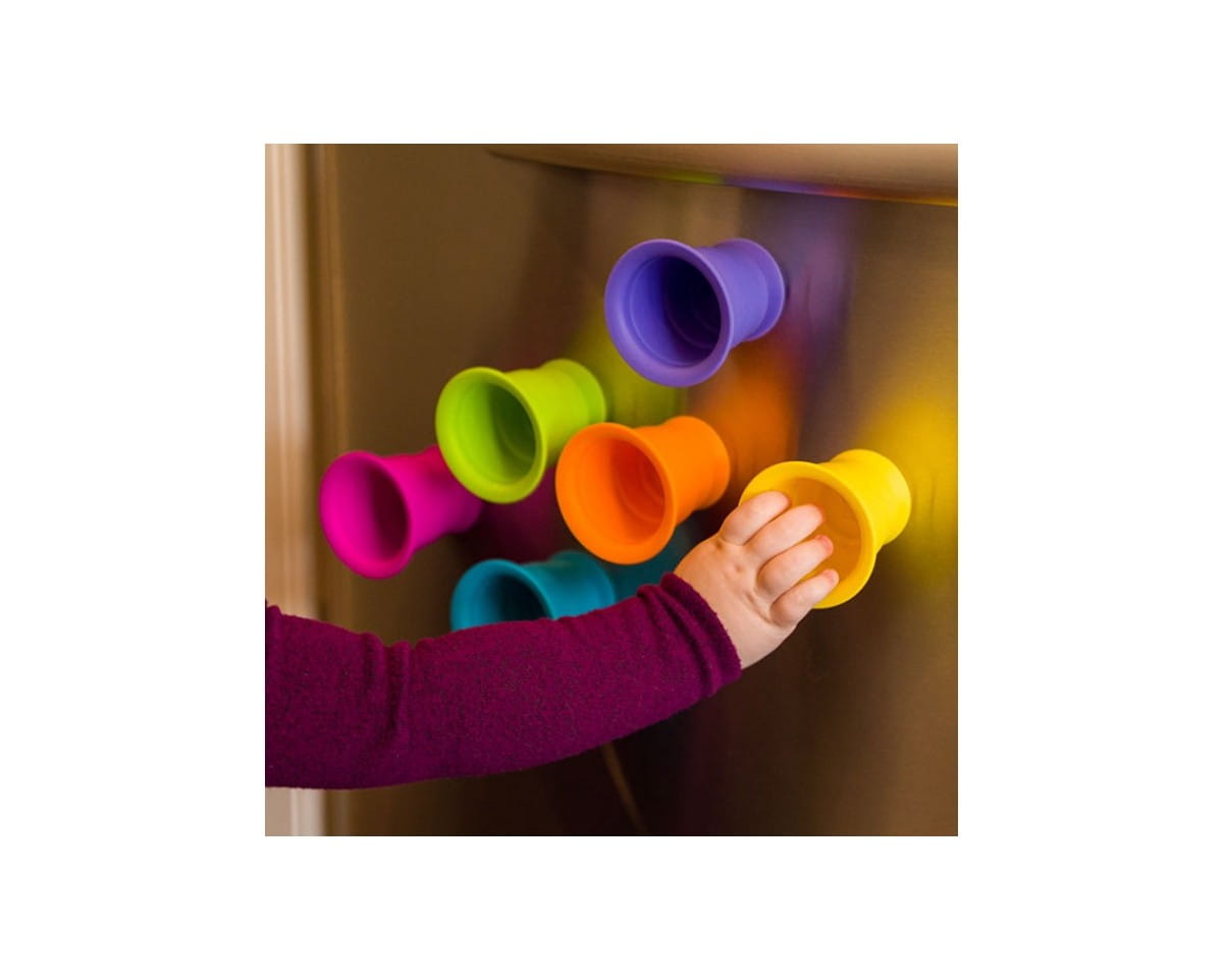 Układaj, zgniataj, przysysaj sześć miękkich, silikonowych kubków, które można przyklejać z obydwu stron do siebie i gładkiej powierzchni. Każdy z tych miękkich i pięknie kolorowych kubeczków, ma w podstawie przyssawkę, dzięki czemu kubeczki przysysają się do siebie oraz gładkich poziomych i pionowych powierzchni jak lustro, okna, wanna, drzwi lodówki i wiele wiele innych. Kubeczki wykonane są ze 100% silikonu, dlatego są bezpiecznie i można także z nich pić i jeść.