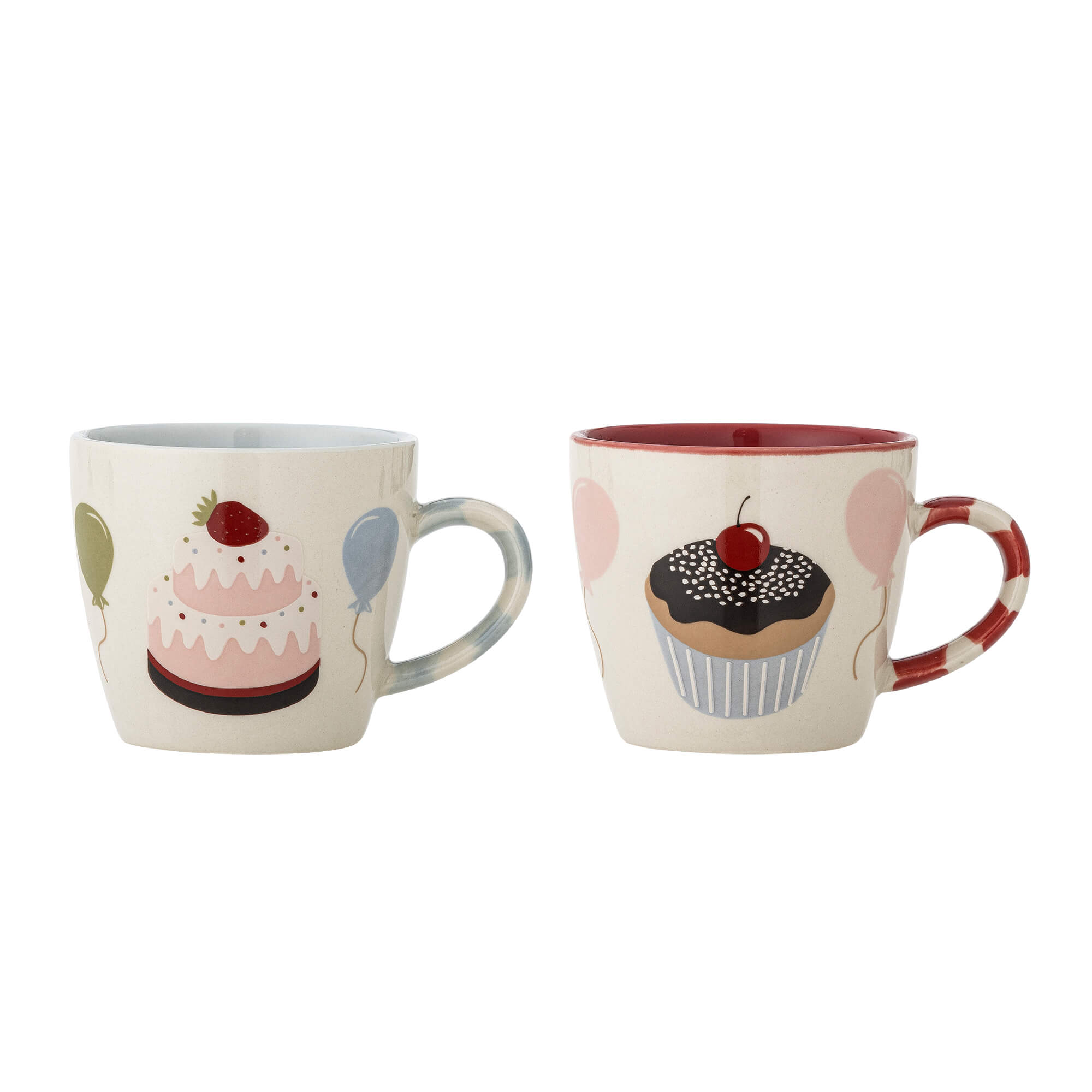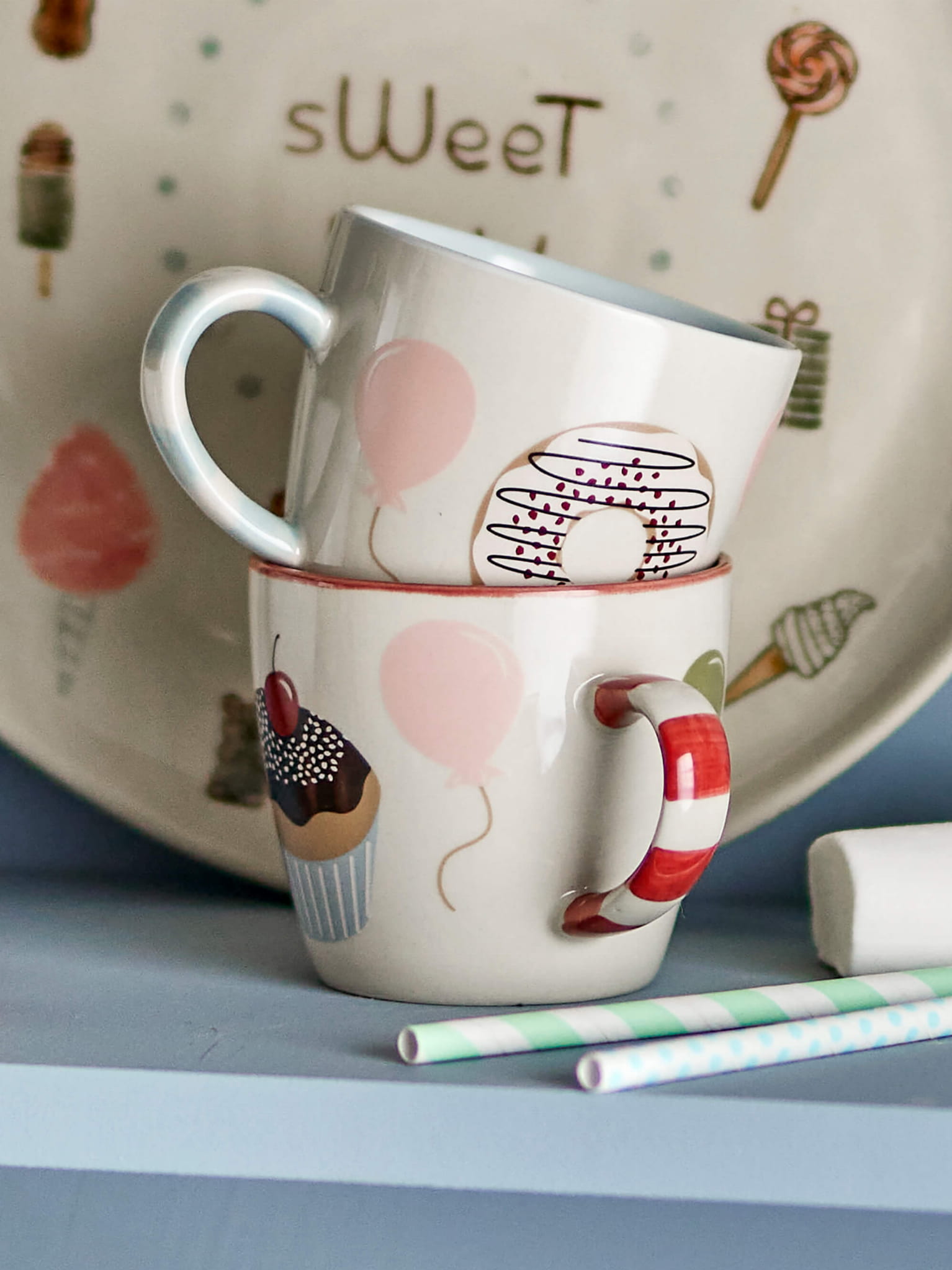Filiżanki ozdobione są najbardziej urodzinowymi ciastkami i balonami, a uchwyty zdobią delikatne paski w odcieniach niebieskiego i czerwonego. Kubki mają idealny rozmiar dla małych rączek i mogą być używane do serwowania zarówno gorących, jak i zimnych napojów.
