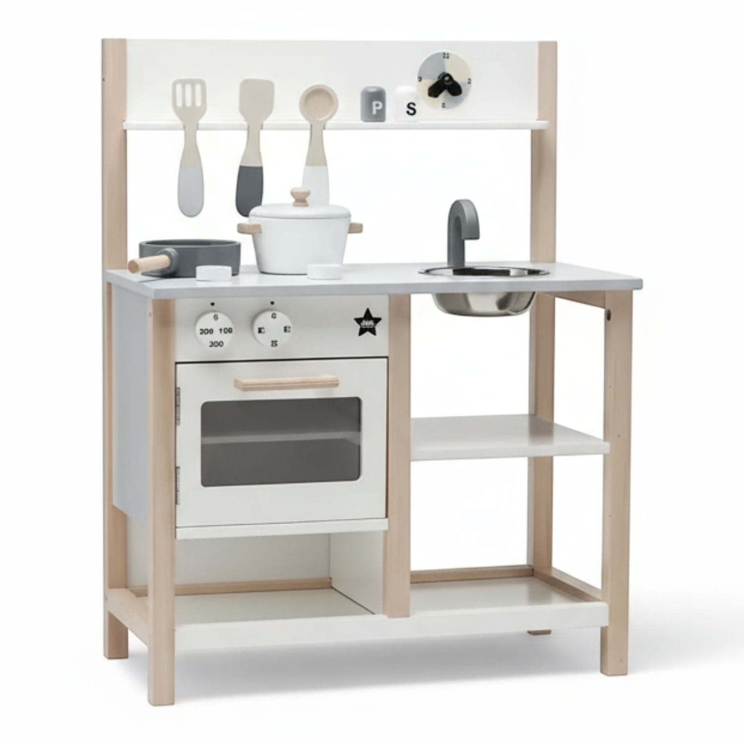 Zestaw zawiera kuchenkę z garnkami i zlewozmywaka oraz akcesoria kuchenne. Zegar umieszczony nad kuchenką uczy odmierzania czasu i pozwala zaplanować czas na posiłki. Całość jest starannie wykończona i bezpieczna w użytkowaniu. Zabawa zestawem rozwija zdolności ruchowe oraz wyobraźnię dziecka. Zabawka inspiruje dzieci do kreatywnej zabawy. Idealnie pasuje dla Małego szefa kuchni lub piekarza. Produkt zgodny z aktualnymi standardami bezpieczeństwa UE.