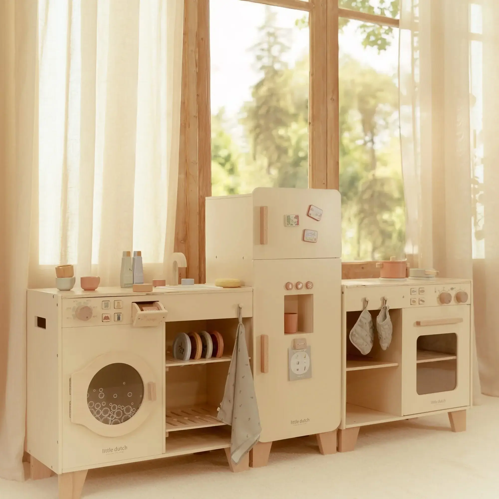 Kuchnia Little Dutch to połączenie estetyki i zabawy w najlepszym wydaniu. Zestaw nie tylko dostarcza dzieciom wielu godzin radości, ale również pięknie prezentuje się w pokoju dziecięcym. Zabawka wykonana jest z solidnego drewna, malowanego bezpiecznymi farbami na bazie wody, dzięki czemu jest trwała, estetyczna i w pełni bezpieczna dla dzieci. To piękny, ponadczasowy element zabawy, który posłuży przez długie lata. Kuchnia doskonale komponuje się z lodówką oraz pralką Little Dutch, tworząc pełen uroku, kompletny kącik kuchenny.