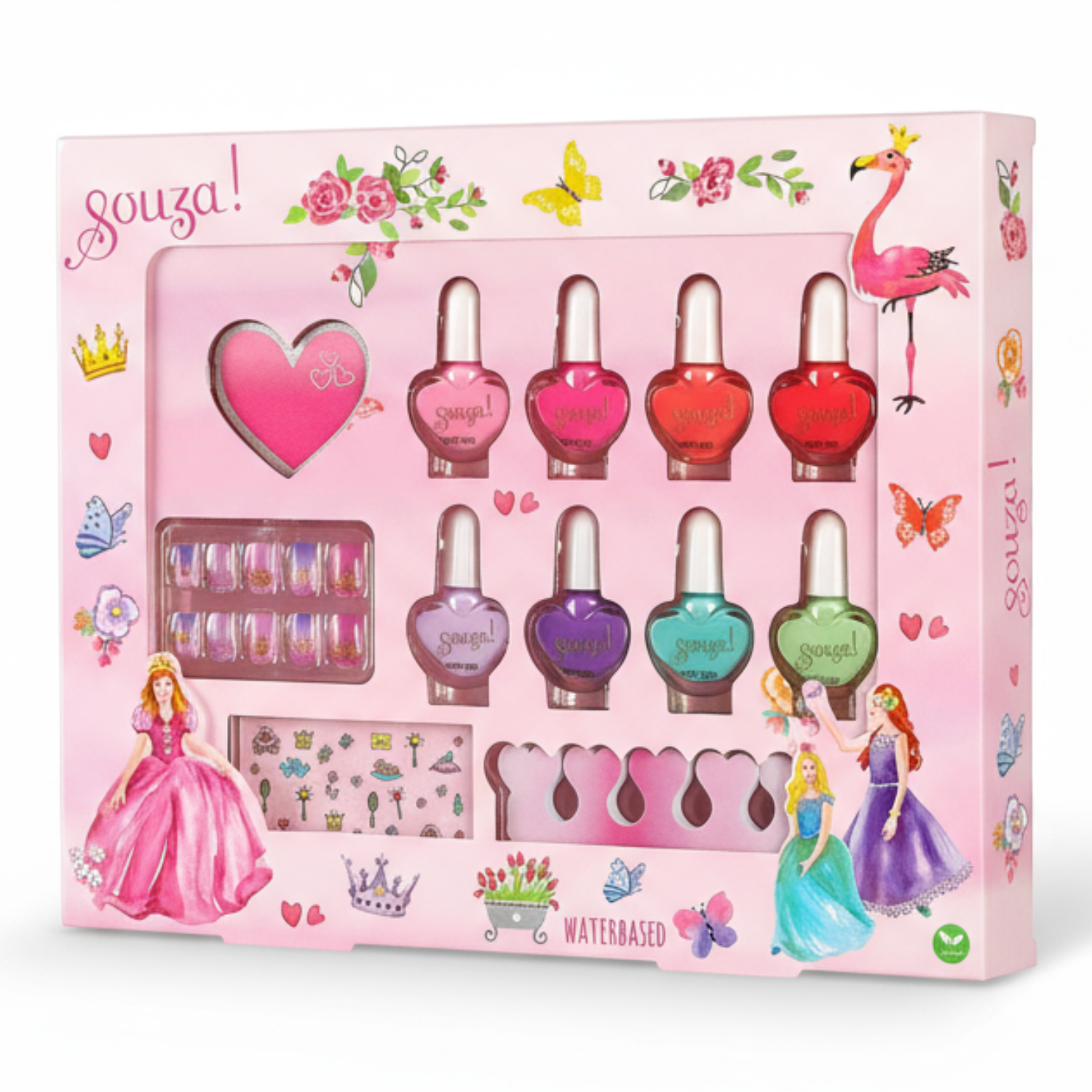 W jego skład wchodzi 8 buteleczek lakierów (po 5 ml) w pięknych kolorach: jasnoróżowym, fuksjowym, koralowym, czerwonym, liliowym, fioletowym, turkusowym oraz jasnozielonym, a także arkusz naklejek na paznokcie z motywami księżniczek, tipsy, separator do palców i pilniczek-serce.