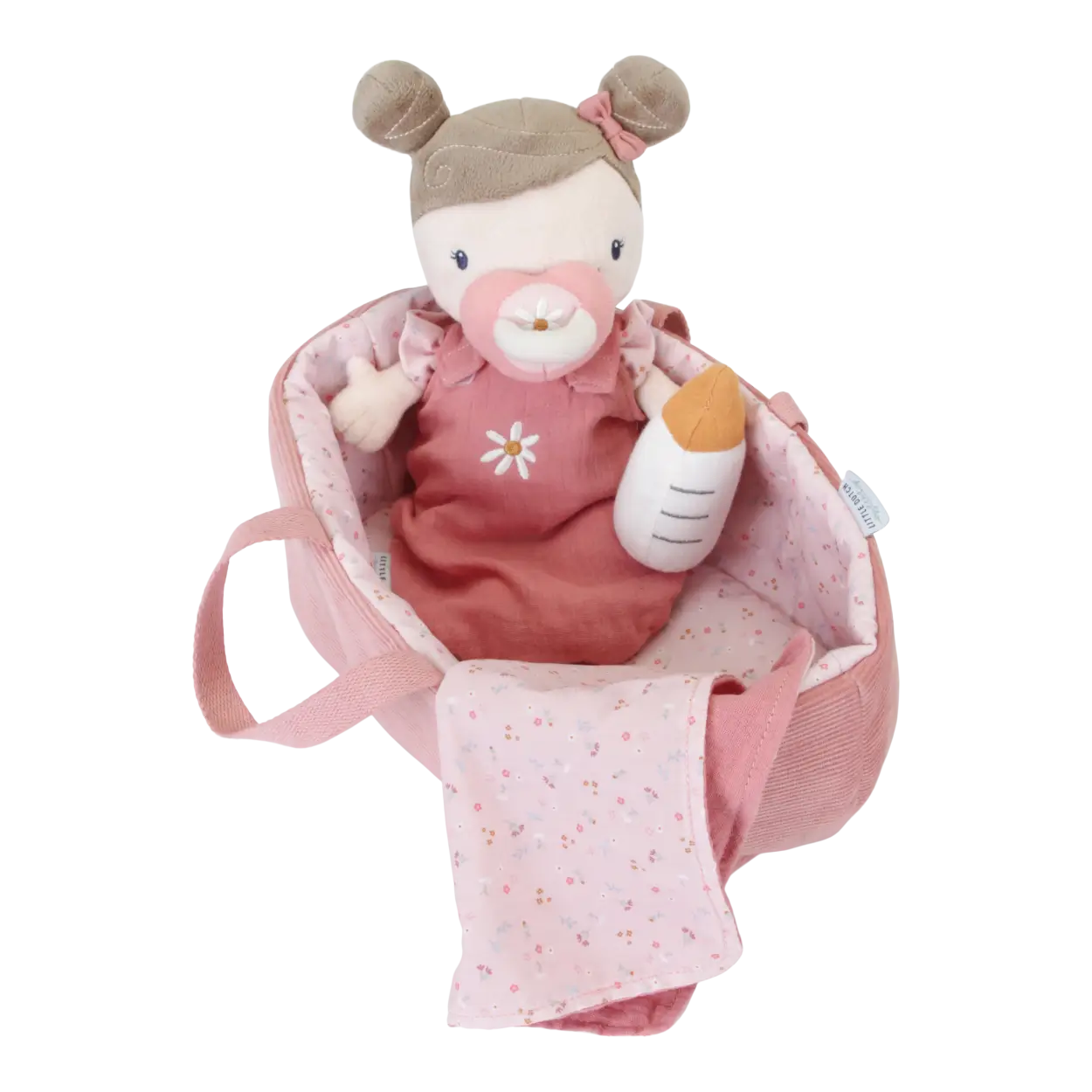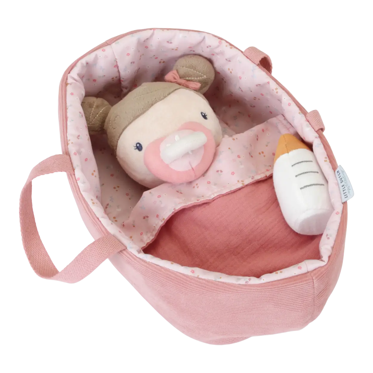 Cały zestaw, razem z nosidełkiem, utrzymany jest w różowej kolorystyce z motywem z kolekcji Little Pink Flowers. Zestaw zawiera: laleczkę, zdejmowane ubranko, pieluszkę, dwustronny kocyk i śpiworek. Do zestawu dołączona jest również buteleczka i smoczek na magnes. Dziecko od najmłodszych lat uczy się opieki nad maluszkiem. Może zobaczyć jak należy malucha prawidłowo ubierać / rozbierać oraz karmić buteleczką i jak zajmować się małą przyjaciółką. Stanowi świetne uzupełnienie do pozostałych zabawek z kolekcji Little Pink Flowers oraz laleczek od Little Dutch. Doskonały pomysł na prezent.