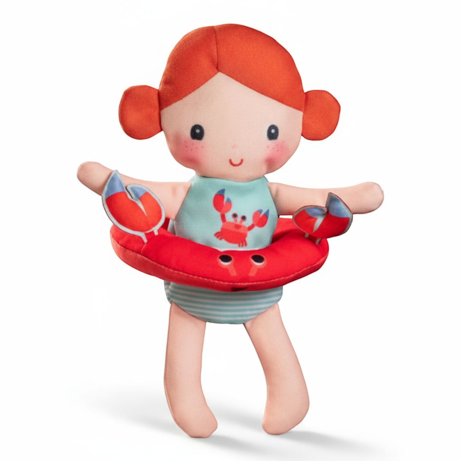 Zabawka wykonana z miękkiego, łatwego do czyszczenia i szybkoschnącego matriału. Ma postać małej dziewczynki z dwoma rudymi koczkami, w jednoczęściowym stroju z podobizną kraba oraz czerwonym kołem do pływania z oczami i szczypcami tego stworzenia. Zabawka jest perfekcyjnie wykończona, z dbałością o każdy szczegół i w pełni bezpieczna dla dziecka. Umila czas spedzony w wannie, a przy okazji rozwija sprawność motoryczną (chwyt, wkładanie i wyjmowanie laleczki z koła) oraz wyobraźnię (snucie opowieści).