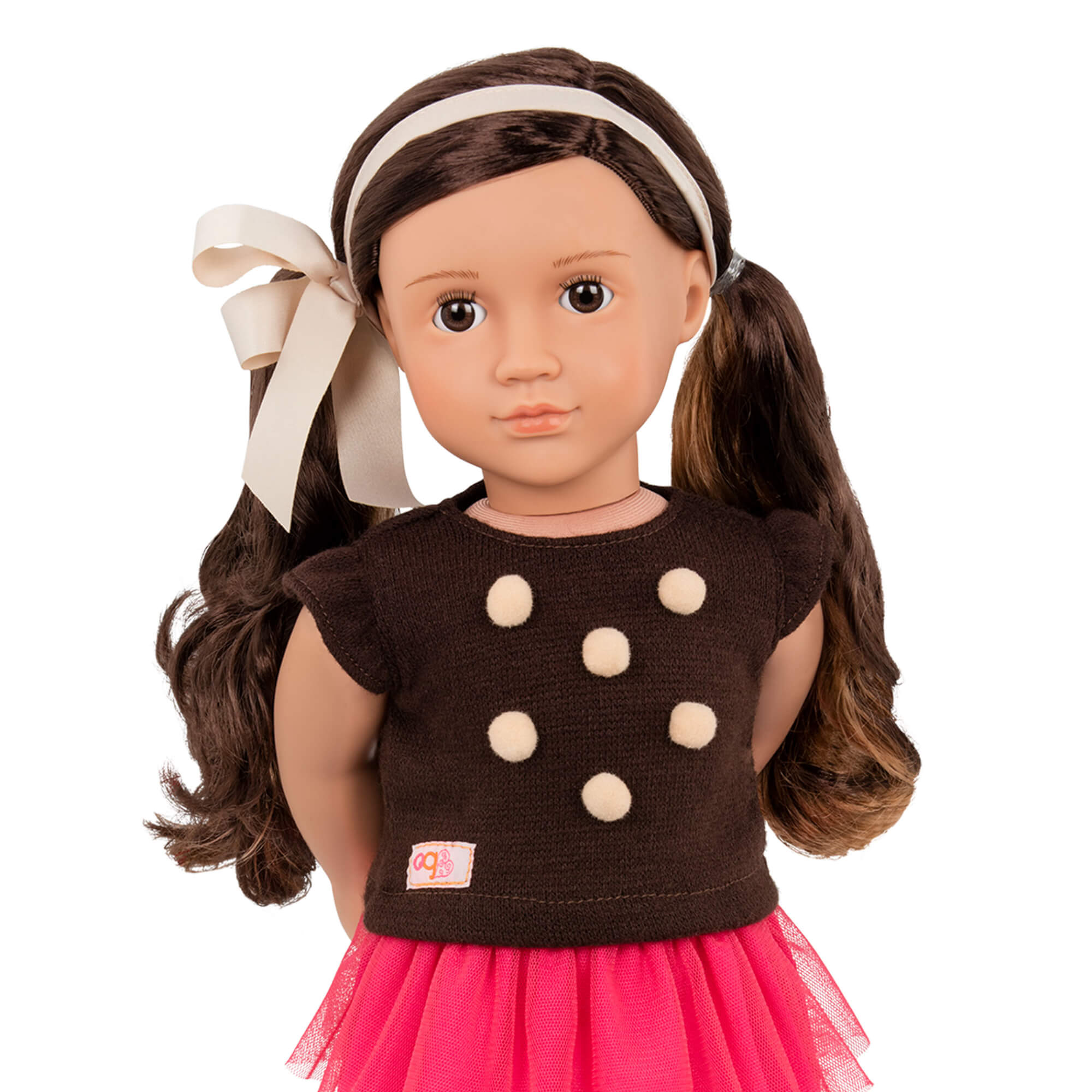 Poznaj Avię - uroczą lalkę o wysokości 46 cm z kultowej serii Our Generation, która stanie się wierną towarzyszką każdej zabawy. Ta brunetka z subtelnymi, jasnymi refleksami we włosach, ubrana w stylowe pomponiki, zaprasza do świata kreatywności i niezapomnianych opowieści.