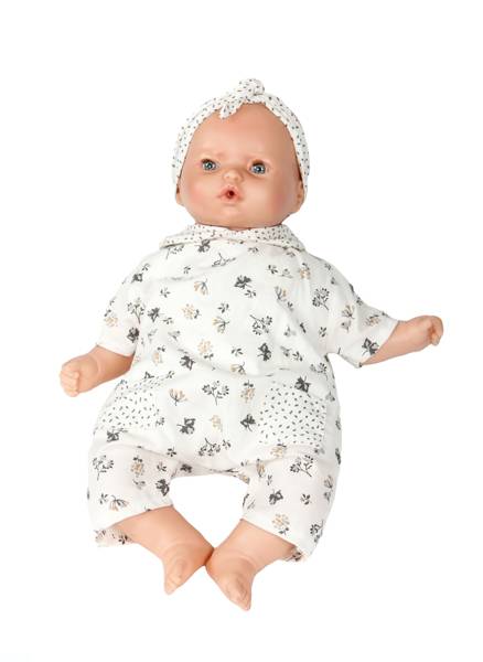 Brzuszek lalki jest miękki i materiałowy, natomiast buzia, rączki i nóżki są wykonane z twardszego materiału. Lalka posiada w zestawie smoczek i ubranko widoczne na zdjęciu. Duża lalka posiada również rzęsy.