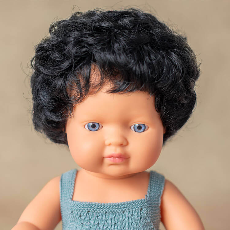 - Lalka chłopiec Europejczyk posiada jasną skórę, czarne kręcone włosy oraz niebieskie oczy