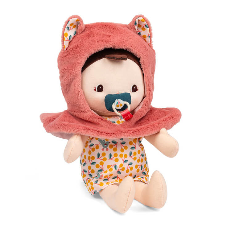 Jest idealna do zabierania na wycieczki, tulenia, usypiania czy uspokajania. Laleczka ma poręczny rozmiar – 24 cm, brązową fryzurkę, wygodny strój (zdejmowany ramper w uroczy wzór z przyszytym smoczkiem, który dzięki magnesowi można umieścić przy jej ustach, by nie spadał podczas spacerów) oraz niezbędne akcesoria: nosidełko na regulowanych szelkach, które łatwo dopasować do dziecka, i ciepły kaptur-czapeczkę w formie pelerynki z kocimi uszkami.