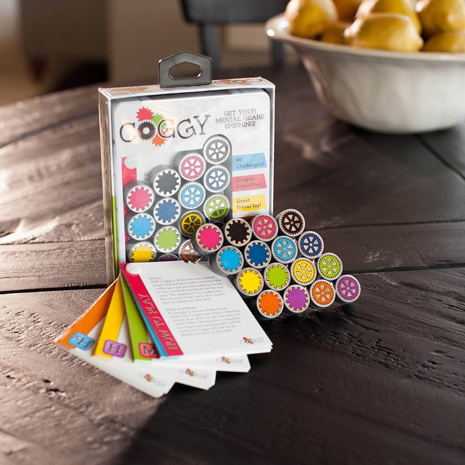 Coggy to 16 połączonych kółek zębatych, 40 wyzwań o 4 poziomach trudności (łatwe, średnie, trudne, bardzo trudne), obracaj, modeluj, układaj kolorowe kółka zębate, tak aby odtworzyć wzór na załączonych kartach. Coggy to gra, która rozwija inteligencję przestrzenno-wizualną, myślenie logiczne, zdolność krytycznego myślenia.
