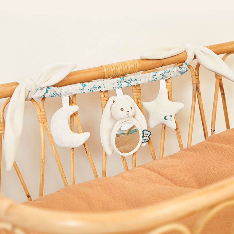 Jest piękna i perfekcyjnie wykończona. Utrzymana w bardzo jasnym kremowym kolorze. Ma długie zakończenia po obu stronach, imitujące królicze uszy, dzięki czemu łatwo się ją mocuje do ramy wózka, fotelika czy łóżeczka, po prostu wiążąc je na supeł. Zawieszki pełnią różne funkcje: księżyc szeleści przy dotykaniu, brzuszek króliczka to bezpieczne lusterko, wspierające rozwój zmysłu wzorku, a gwiazdka to grzechotka. Łańcuch wykonany został z przyjemnego w dotyku weluru o fakturze drobnego sztruksu. Wspiera naukę chwytania i rozwój sensoryczny, aktywizuje również zmysł dotyku i słuchu.
