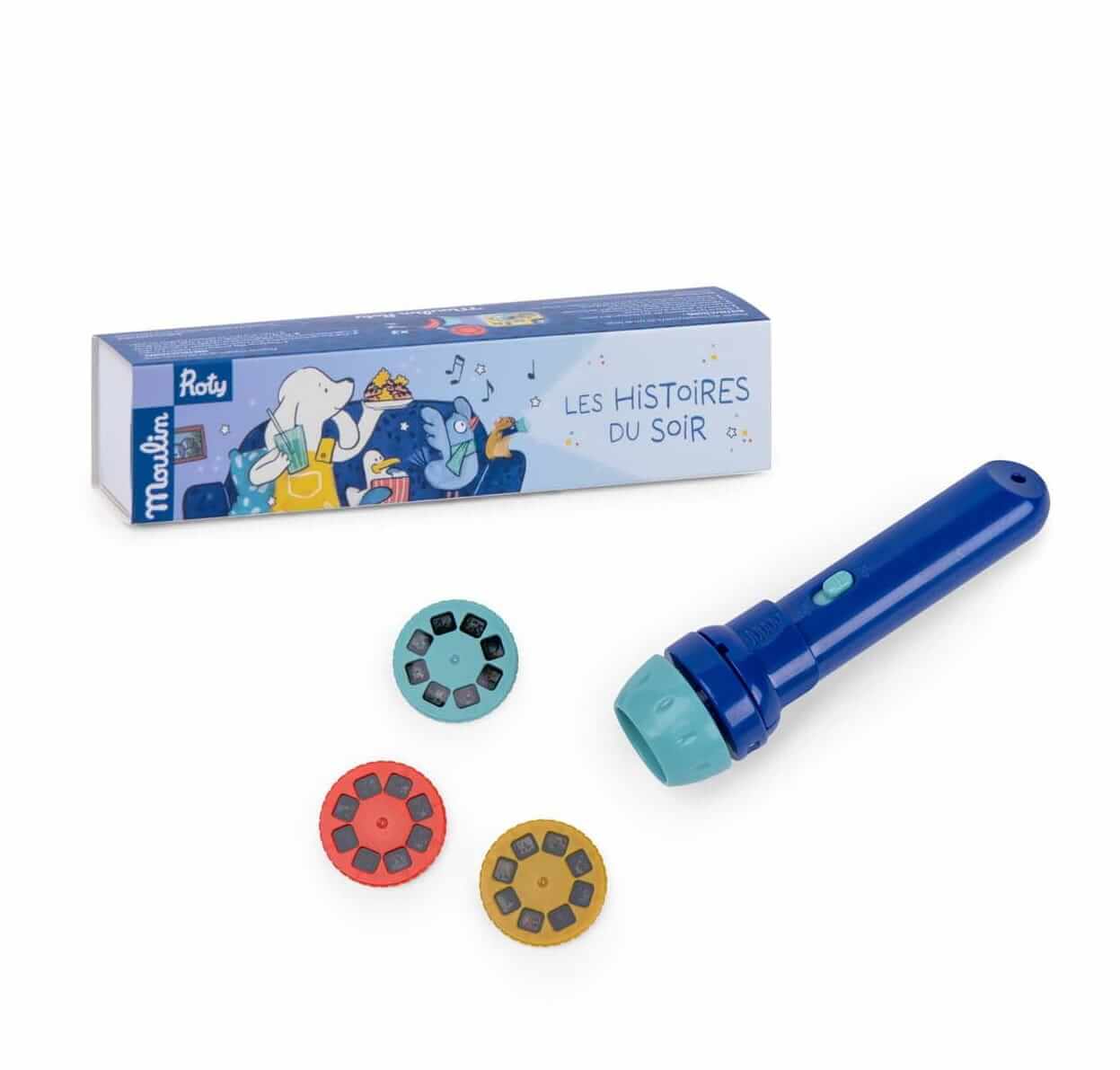 W zestawie znajdują się 3 dyski, które wkłada się do latarki i wyświetla slajdy na gładkiej ścianie. Bajki opowiadają historie bohaterów kolekcji Puce & Pilou. Podczas zabawy z latarką -projektorem dziecko rozwija zdolności poznawcze, kreatywność i wyobraźnię. Oglądanie slajdów i opowiadanie historii to ciekawa alternatywa do wieczornego czytania książeczek i pomysł na wartościowy czas spędzony w rodzinnym gronie.
