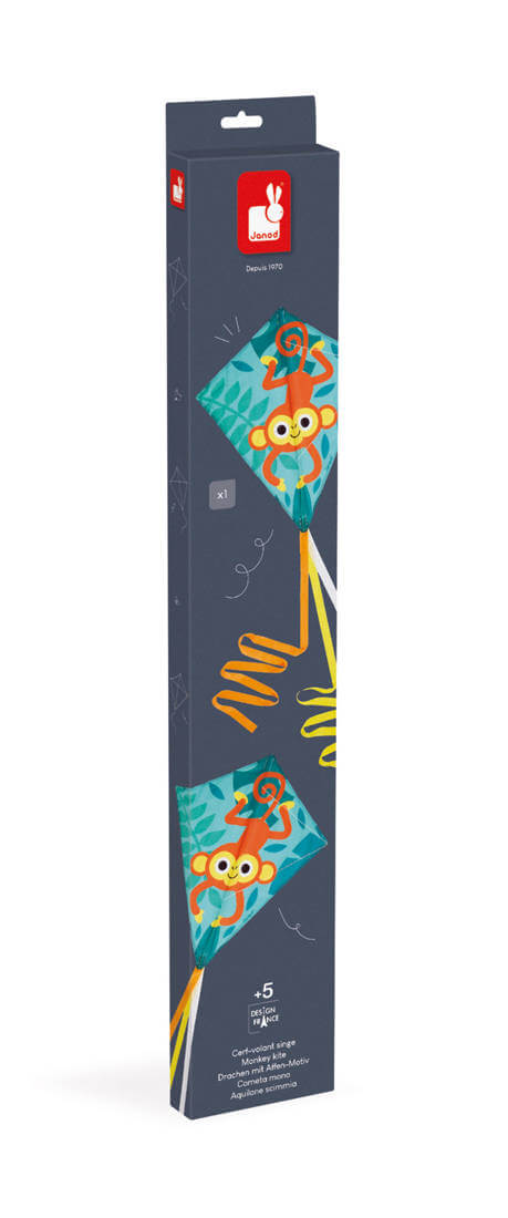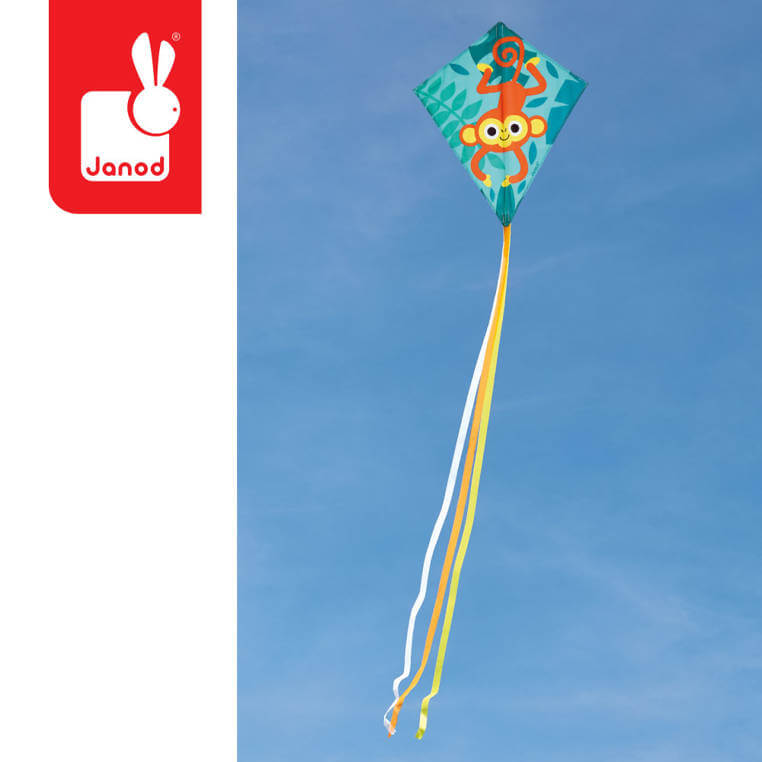 Latawiec wykonany z solidnego włókna szklanego, ma tradycyjny czworokątny kształt, kolorowe paski, które powiewają na wietrze, a na zielono-turkusowym tle w motywy roślinne grafikę zabawnej małpki. Puszczanie latawca to świetna zabawa zręcznościowa, zachęcająca do aktywności plenerowych, sprawdza się np. na plaży, podczas spacerów czy pikników.