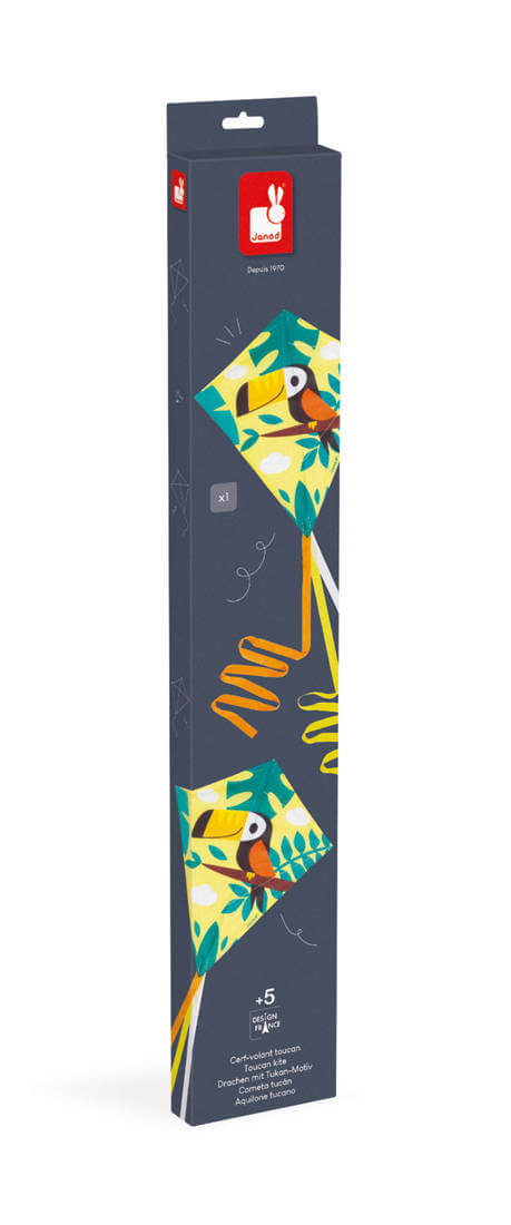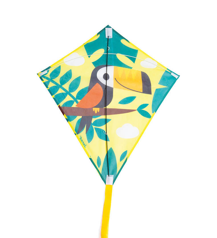 Latawiec wykonany z solidnego włókna szklanego, ma tradycyjny czworokątny kształt, kolorowe paski, które powiewają na wietrze, a na żółto-turkusowym tle w motywy roślinne grafikę wesołego tukana. Puszczanie latawca to świetna zabawa zręcznościowa, zachęcająca do aktywności plenerowych, sprawdza się np. na plaży, podczas spacerów czy pikników.
