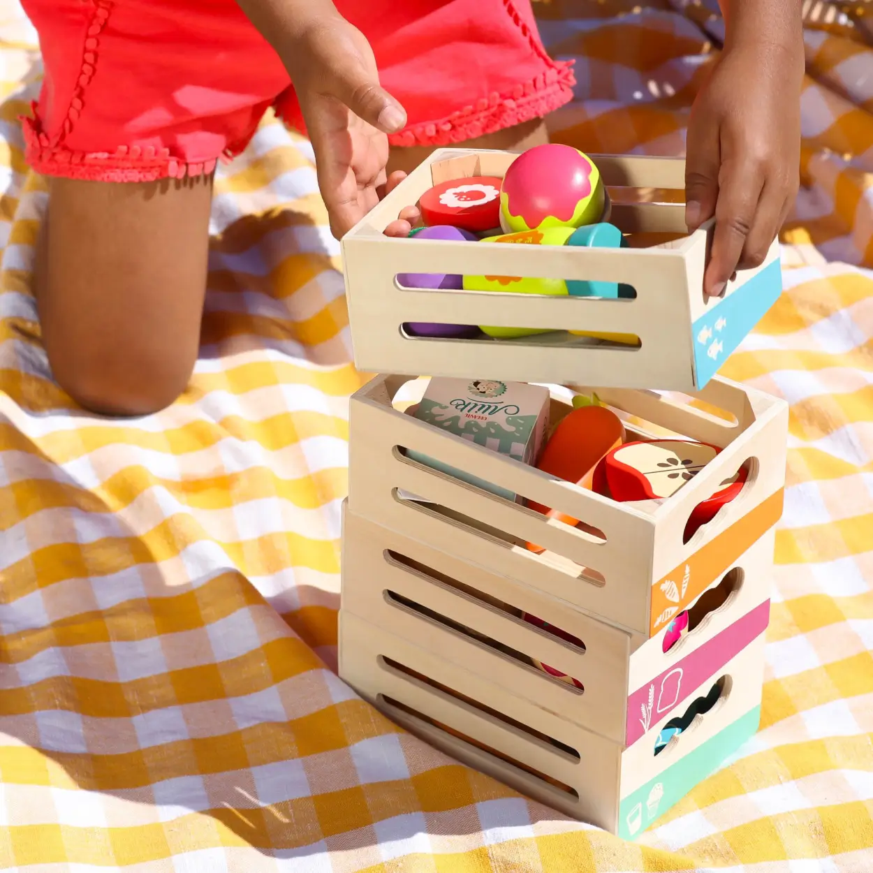 Zabawka edukacyjna – cztery urocze drewniane skrzyneczki z wygodnymi pochwytami, służące DO GRUPOWANIA żywności w kategorie: