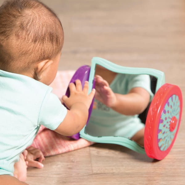 Jeżdżąca wańka-wstańka w nietypowym wydaniu. Lusterko łatwo się przemieszcza – wystarczy lekko go popchnąć – i nigdy się nie przewraca. Wzbudzi w maluszku ciekawość własnego odbicia, zachęci do prób wprawienia zabawki w ruch lub jej okiełzania.