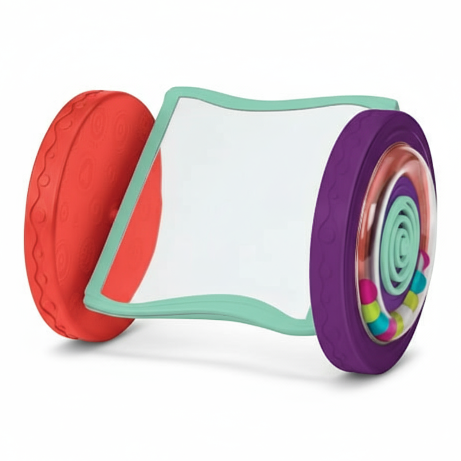 Dodatkowo, każde z kółek zawiera inną atrakcję – z jednej strony są to przemieszczające się koraliki, z drugiej kontrastujący wzór, który wiruje kiedy kółka się kręcą. Zabawka stymuluje zmysł wzroku, słuchu i dotyku, sprzyja integracji sensorycznej. Rozwija zdolności percepcyjne oraz koordynację ruchową.