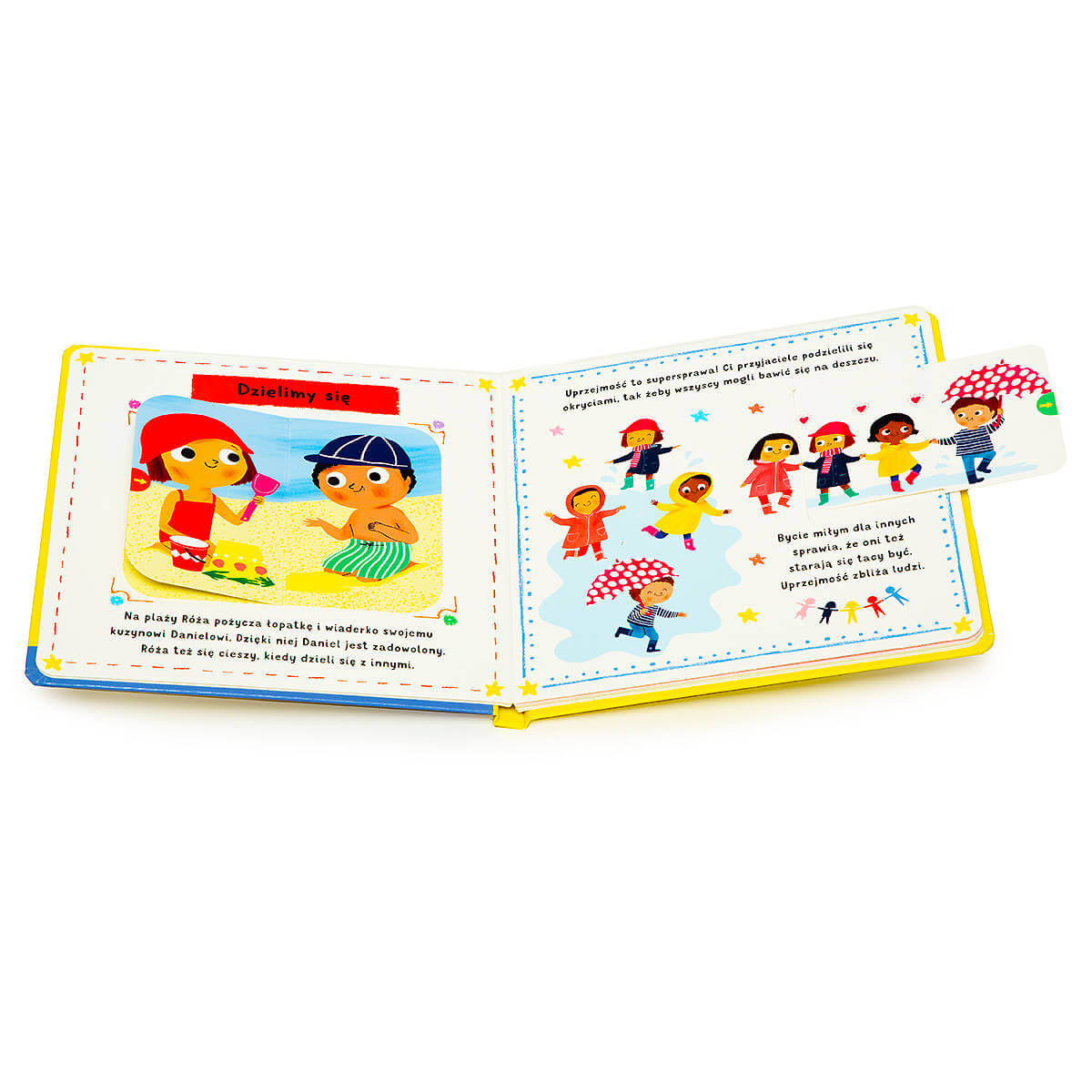 Książeczka „Lubię być miły. Akademia mądrego dziecka. Poznaj uczucia i emocje” pokazuje dziecku, co oznacza bycie miłym. Każda rozkładówka to inny, prosty przykład uprzejmego zachowania, które jest możliwe do wdrożenia w codziennym życiu malucha. Jest tu opisane pomaganie innym, dzielenie się i dbanie o drugiego człowieka. Na jednej z ostatnich stron znajduje się ruchomy suwak emocji, który pozwala dziecku na zaznaczenie, ile miłych rzeczy udało mu się zrobić danego dnia. Na końcu książki znajduje się także zbiór praktycznych porad dla rodziców, które pozwolą znaleźć odpowiedź na pytania, jak pomóc dziecku radzić sobie z emocjami, jak efektywnie wspierać jego rozwój emocjonalny i jak radzić sobie z negatywnymi uczuciami.