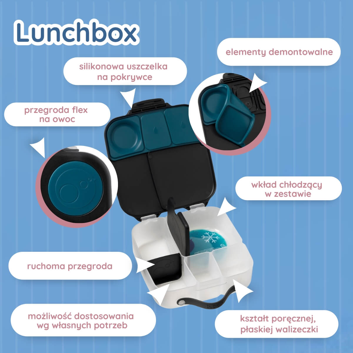 Pudełko śniadaniowe z poręcznym uchwytem skrywa w sobie małe i duże przegrody, dzięki którym zapakujesz dziecku do szkoły lub na wycieczkę jego ulubione potrawy i przekąski. Lunchbox b.box ma kilka sprytnych rozwiązań. Ruchome przegrody, które można przestawiać lub wyjąć by zmieścić w pudełku całego banana lub jabłko. Dużą kwadratową przegrodę w sam raz na apetyczny makaron z warzywami lub kanapki. Ta przegroda ma praktyczny "patent". Podwójne dno, pod które możesz schować dołączony do zestawu wkład chłodzący. Dzięki niemu produkt w przegrodzie dłużej pozostanie chłodny i świeży. Rozwiązanie idealne szczególnie gdy za oknem słońce i wysokie temperatury. Silikonowa uszczelka przykrywająca mniejsze przegródki umożliwi przenoszenie w nich miękkich soczystych owoców, jogurtu lub dipu do warzyw. Jednym słowem, przygotowując dziecku drugie śniadanie, lunch czy prowiant na wycieczkę nie musisz rezygnować z różnorodności i właściwego zbilansowania posiłku.