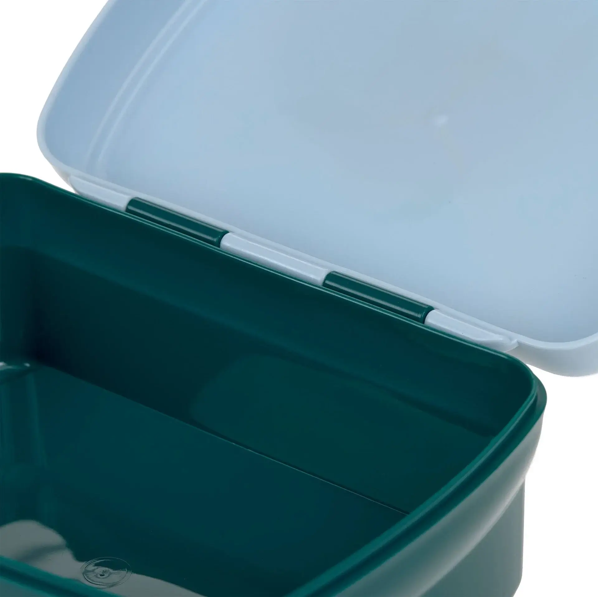 Jest pojemne i sprytnie podzielone na część główną (na dole), która pomieści np. kanapki oraz wyjmowaną, dwudzielną wkładkę na przekąski, np. pokrojone owoce czy wafelki, którą można umieścić w górnej przestrzeni. Dwupoziomowy lunchbox jest szczelny i solidny, wygodny do zamykania i otwieranie za pomocą szerokiego klipsa z przodu. Ma ergonomiczny kształt i mieści się nawet do małego plecaka.
