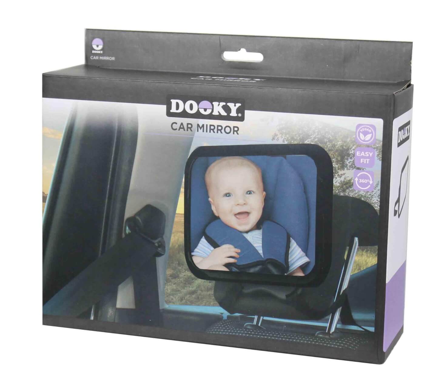 Lusterko można szybko i łatwo przymocować za pomocą 2 pasków napinających do zagłówka nad fotelikiem samochodowym dziecka. Lusterko ma wymiary 25,5 x 17,5 cm i można je obracać o 360 stopni, więc można wybrać dowolną pozycję, aby mieć malucha na oku. Lusterko samochodowe Dooky wykonane jest z wysokiej jakości materiału.