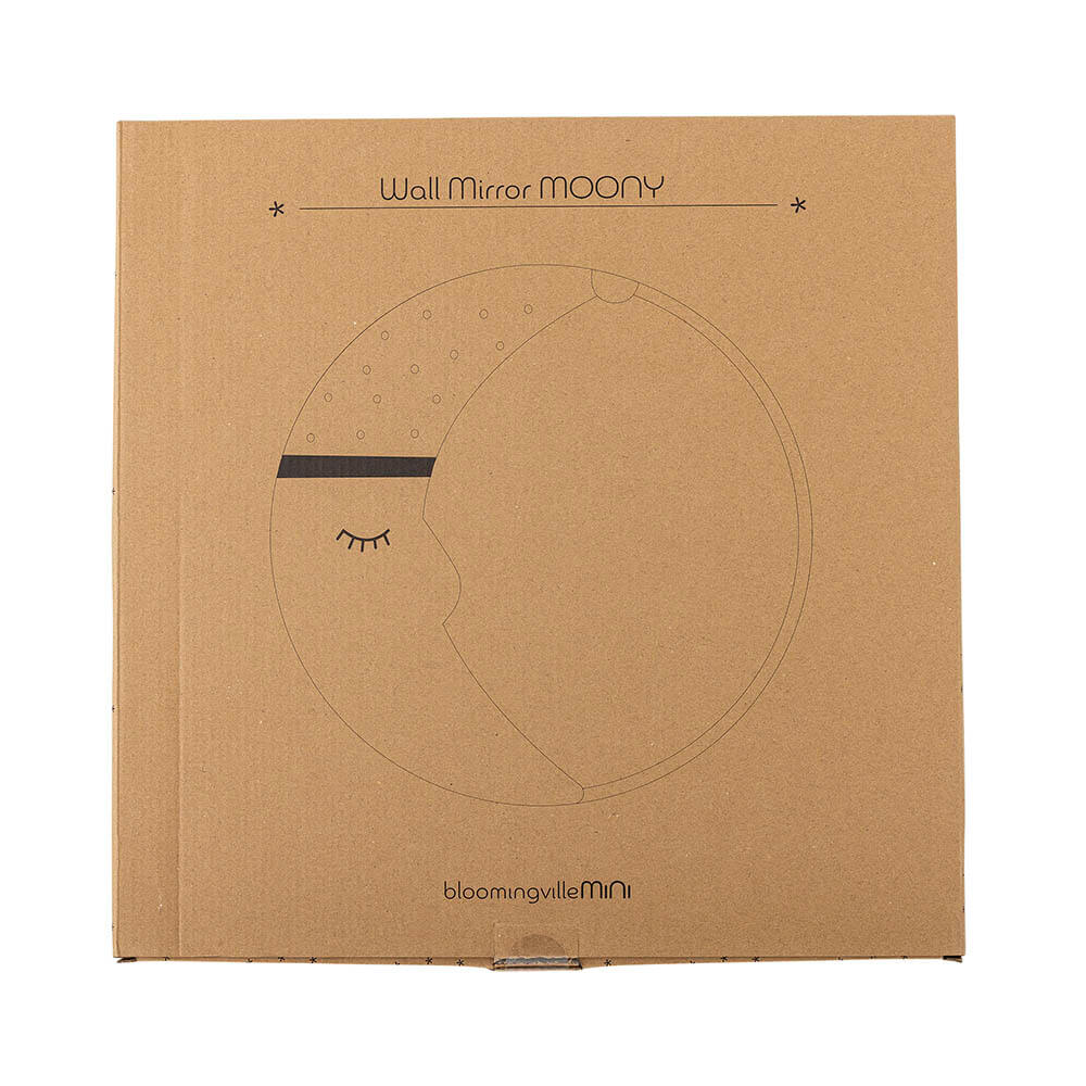 Lustro ścienne Moony Wall Mirror marki Bloomingville MINI jest wykonane z forniru z certyfikatem FSC i przedstawia najsłodszy księżyc na dobranoc
