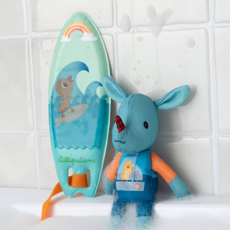 Wykonana z miękkiego, łatwego do czyszczenia i szybkoschnącego materiału. Ma postać niebieskiego Smoka Joe w suferskiej piance z zamocowaną do nogi deską do pływania. Pod wpływem temperatury wody (powyżej 25ºC) wzór na desce i kostiumie „magicznie” się zmienia. Zabawka jest perfekcyjnie wykończona, z dbałością o każdy szczegół i w pełni bezpieczna dla dziecka. Umila czas spędzony w kąpieli, a przy okazji rozwija sprawność motoryczną (chwyt, odpinanie, zapianie paska), ciekawość oraz wyobraźnię (snucie opowieści).