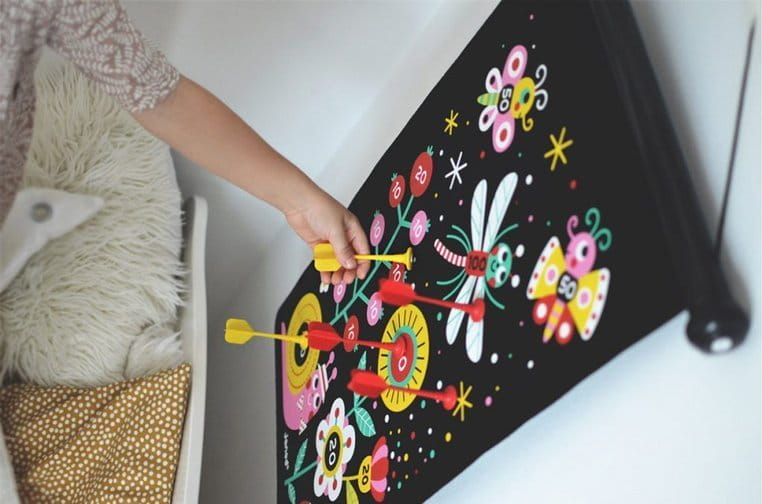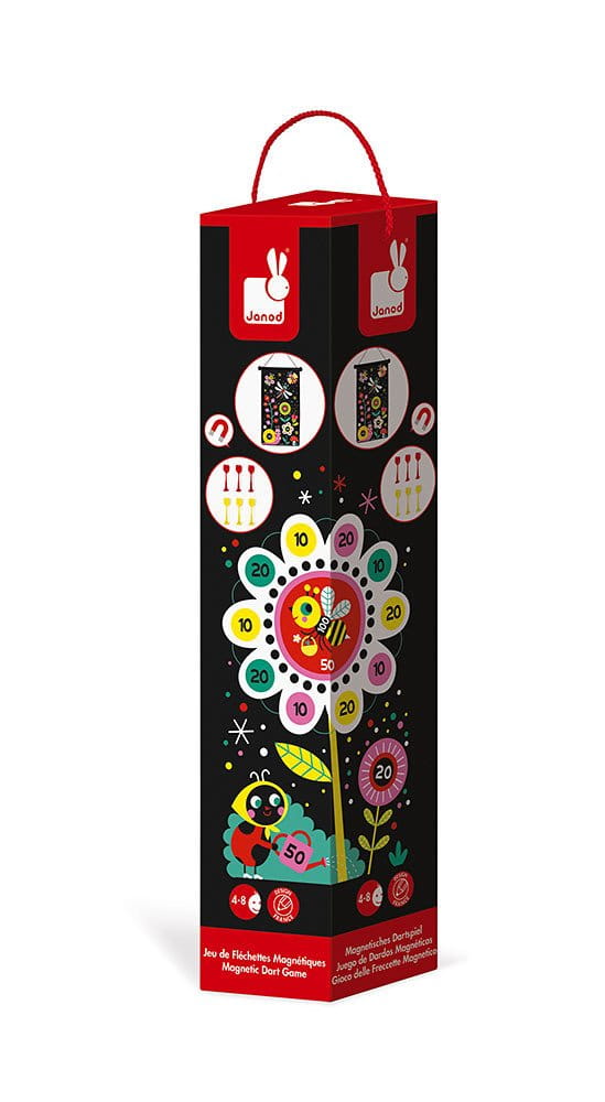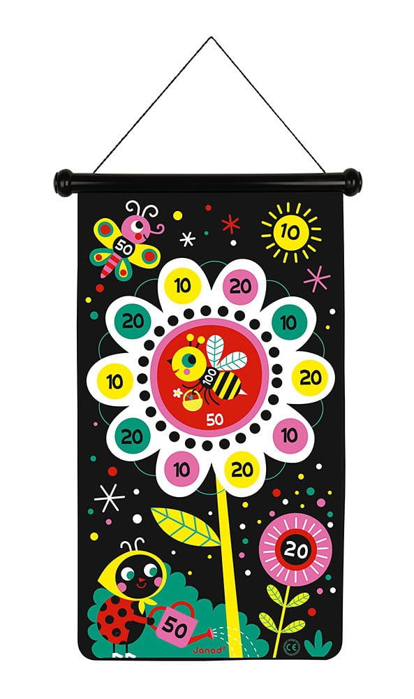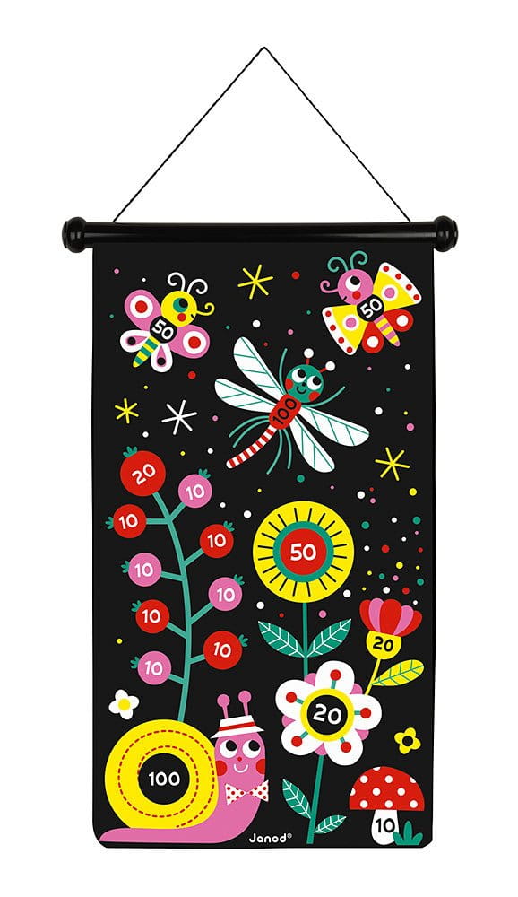 Magnetyczna gra w rzutki Ogród francuskiej marki JANOD to wspaniała zabawa dla dwojga – zarówno dzieci, jak i ich rodziców. Zestaw składa się ze zwijanej na rolkę tarczy ze sznurkiem do jej zawieszenia np. na ścianie oraz z 6 magnetycznych rzutek w dwóch kolorach (3 czerwone i 3 żółte). Czarna tkanina tarczy ilustrowana jest dwustronnie kolorowymi motywami kwiatów i owadów. Rzutkami należy celować w tarczę z odpowiedniej, ustalonej przez graczy odległości, w taki sposób, by trafić w oznaczone na niej punktowane miejsca. Celem gry jest zgromadzenie w trzech rzutach jak największej ilości punktów. Gracz, któremu się to uda, wygrywa.