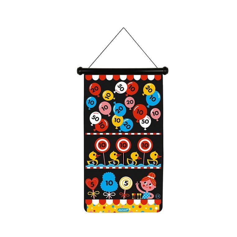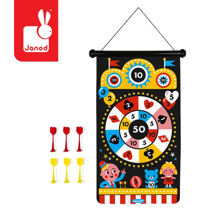 Magnetyczna gra w rzutki Wesołe miasteczko francuskiej marki JANOD to wspaniała zabawa dla dwojga – zarówno dzieci, jak i ich rodziców. Zestaw składa się ze zwijanej na rolkę tarczy ze sznurkiem do jej zawieszenia, np. na ścianie, oraz z 6 magnetycznych rzutek w dwóch kolorach (3 czerwone i 3 żółte). Czarna tkanina tarczy ilustrowana jest dwustronnie kolorowymi motywami typowymi dla strzelnicy z wesołego miasteczka, m. in balonami, kaczuszkami czy kołem fortuny. Rzutkami należy celować w tarczę z odpowiedniej, ustalonej przez graczy odległości, w taki sposób, by trafić w oznaczone na niej punktowane miejsca. Celem gry jest zgromadzenie w trzech rzutach jak największej ilości punktów. Gracz, któremu się to uda, wygrywa.