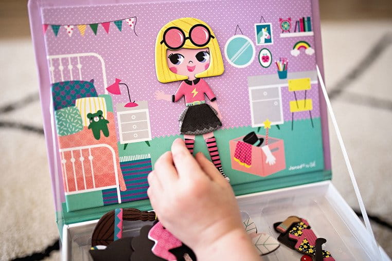 Magnetyczna układanka Magnetibook francuskiej marki JANOD to świetna rozrywka dla małych kreatorek mody, a także wszystkich twórczych dzieci. Zabawa polega na układaniu na planszy magnesów, które dziecko może dowolnie łączyć we wzory. Układanka ta będzie służyć przed długi czas i nieprędko się znudzi, bo daje wiele możliwości kreacji. Jest pięknie wykonana, co dodatkowo rozbudza zmysł artystyczny, a ponadto ćwiczy logiczne myślenie oraz sprawność manualną u dziecka.