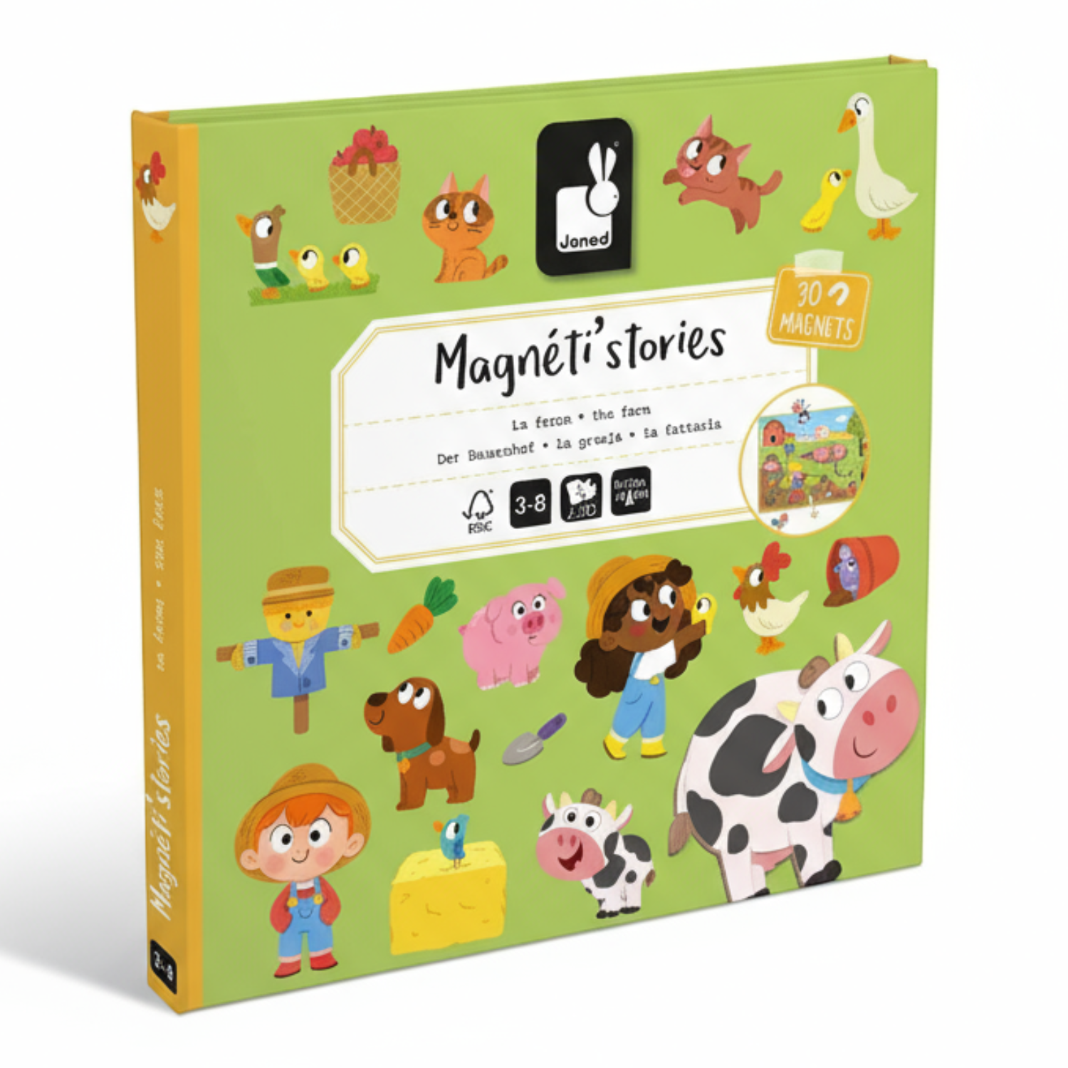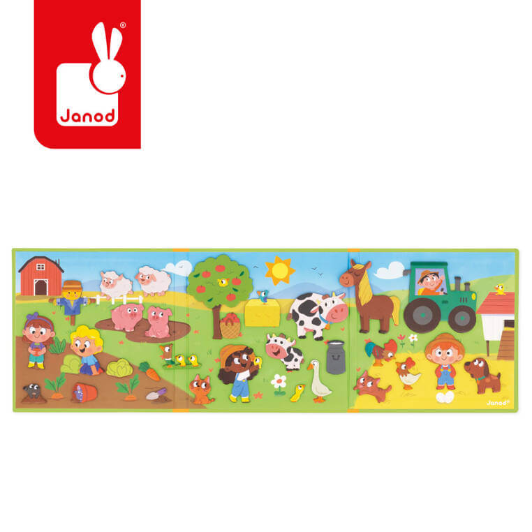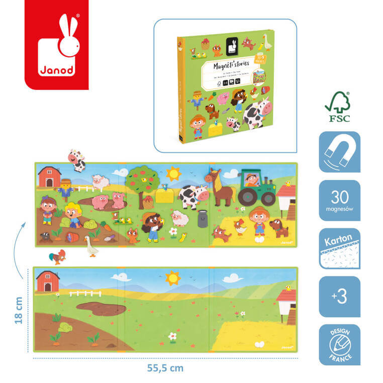 Zawiera 30 magnesów – zwierząt gospodarskich, rolników i ogrodników, dzieci, roślin i innych elementów krajobrazu, które stanowią części składowe do stworzenia oryginalnej ilustracji na rozkładanej potrójnej planszy. Magnesy pozwalają na układanie wymyślonych przez siebie opowieści, których bohaterami są osoby i zwierzęta, żyjące na gospodarstwie. To świetna rozrywka dla wszystkich twórczych dzieci.