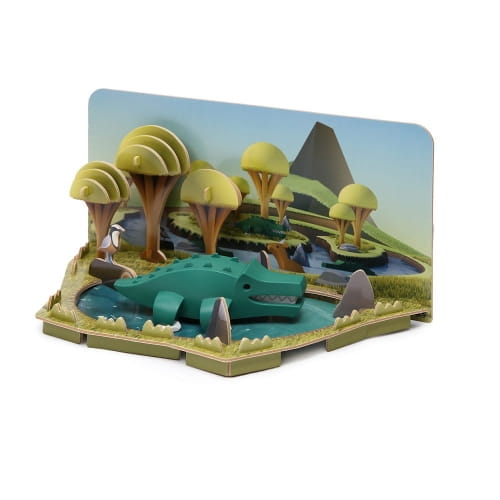 Magnetyczny Składany Krokodyl to pięknie zaprojektowana zabawka, z realistycznym szkieletem do ułożenia pod uroczą magnetyczną skorupą. Interaktywne magnesy utrzymują zewnętrzną warstwę razem, oraz szkieletową układankę 3D, która zapewnia edukacyjną i poznawczą zabawę. Do każdego zestawu dołączona jest makieta sawanny z tłem, drzewami, jeziorem, którą samodzielnie się składa.