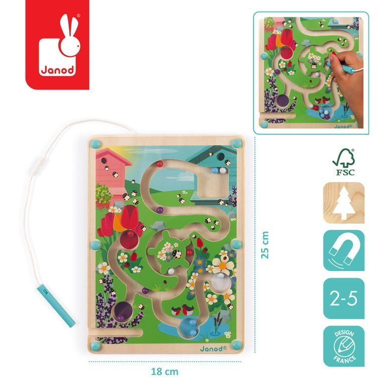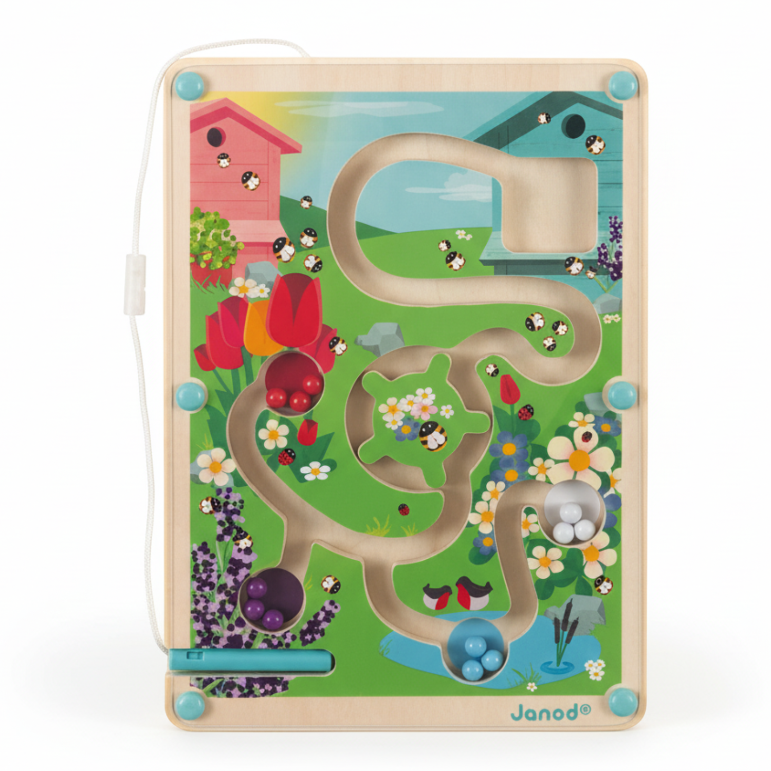 Magnetyczny labirynt Rój francuskiej marki JANOD to doskonała zabawka manipulacyjna dla małych dzieci, która rozwija m.in. chwyt i koordynację ręka-oko. Labirynt korytarzy znajduje się na drewnianej planszy z grafiką ukwieconej łąki i uli, za bezpieczną plastikową szybką. Zabawa polega na przesuwaniu drewnianych kulek za pomocą drewnianego patyczka zakończonego magnesem. Patyczek umieszczony jest na sznurku przy planszy, a pod szybką znajduje się również miejsce na schowanie go. Kulek jest w sumie 12 – po 3 kulki w 4 różnych kolorach (białe, niebieskie, czerwone i fioletowe). Zadaniem malca jest poprzesuwać je w miejsca, odpowiadające im kolorem (tam, gdzie rosną czerwone maki, fioletowa lawenda, białe rumianki i gdzie jest jeziorko z niebieską wodą), a następnie – odprowadzić do ula. Po drodze kulki muszą jeszcze pokonać przeszkodę w postaci obracanego zębatego koła.
