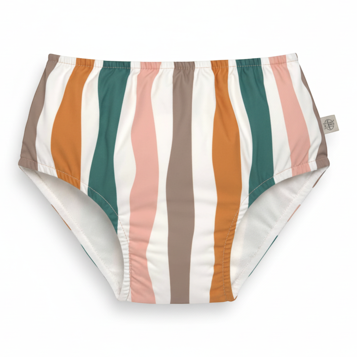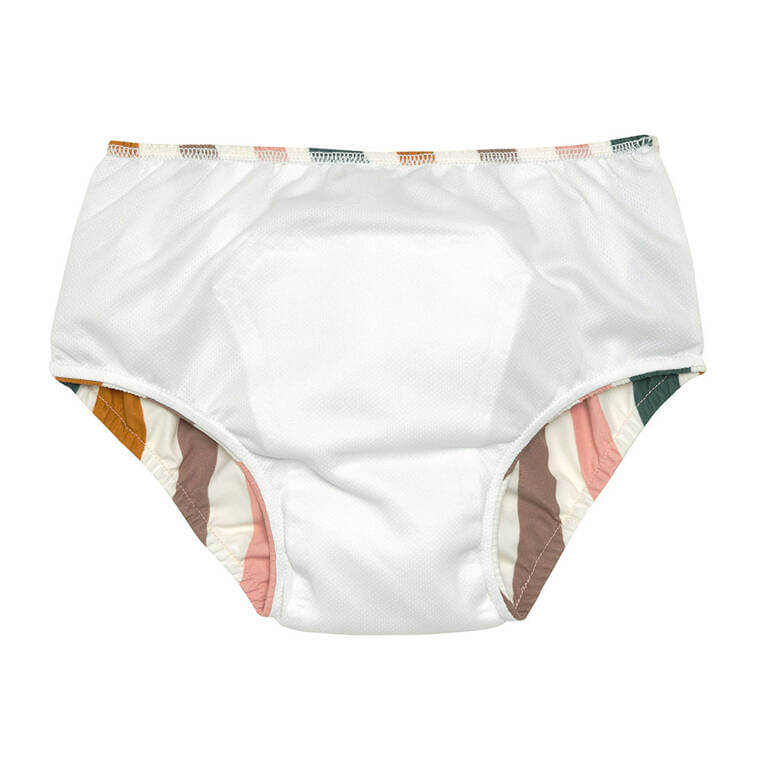 Wykonana jest z miękkiej, przyjemnej do noszenia i szybkoschnącej mikrofibry. Idealna zarówno na basen, jak i na plażę, do nauki pływania, kąpieli w jeziorze czy morzu oraz wszelkich wodnych zabaw. Jest uszyta w formie wygodnych, poręcznych do nakładania majteczek. Ma nieuciskającą gumkę w pasie i przy otworach na nóżki. Zapewnia swobodę ruchów i maksymalną higienę: wewnętrzna oddychająca i chłonna wkładka z mikropolaru chroni skórę dziecka przed wilgocią, a warstwa zewnętrzna jest plamoodporna i łatwa w pielęgnacji. Wzór Waves (Fale) to szerokie nieregularne pasy na białym tle, imitujące fale w oryginalnych kolorach: beżu, karmelu, pudrowego różu i turkusu. Modele dla dziewczynek wyposażone są dodatkowo w uroczą falbankę z tyłu.