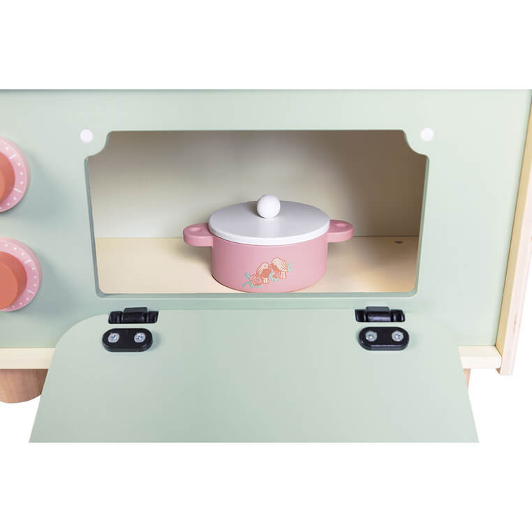 Pozwoli bezpiecznie uczestniczyć w codziennych czynnościach i rozwijać pasję gotowania. Urocza miętowa kuchnia na niewysokich nóżkach posiada: okrągły, metalowy zlew, dwa palniki, piekarnik z magnetycznym zamknięciem, niedużą górną półeczkę z zegarem i boczny reling na ściereczkę.