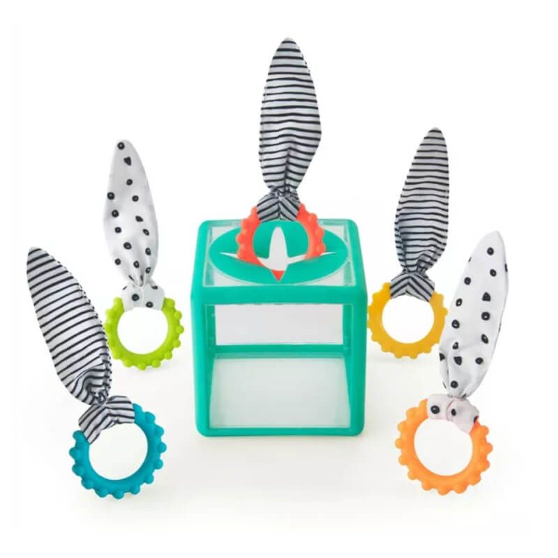 - Krążki i tekstylne końcówki można bezpiecznie miętosić i podgryzać – funkcja gryzaka.
