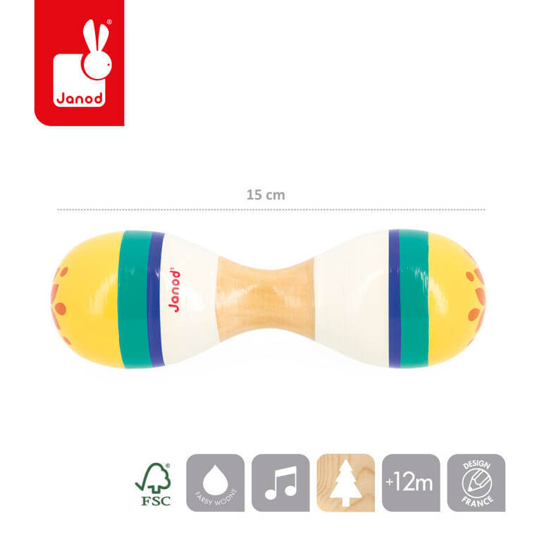 To idealna pierwsza zabkwka muzyczna dla dziecka, która pomaga rozwijać słuch, poczucie rytmu oraz zdolności muzyczneWspiera także rozwój wyobraźni, koncentracji, wytrwałości i koordynacji ruchowej. Marakasy mają dwie zaokrąglone główki i wydają piękny dźwięk przy potrząsaniu. Mają również poręczny rozmiar i radosną kolorystykę. Zabawka została zaprojektowana we Francji. Zapakowana jest w estetyczne, kartonowe pudełko. Idealnie nadaje się na prezent.