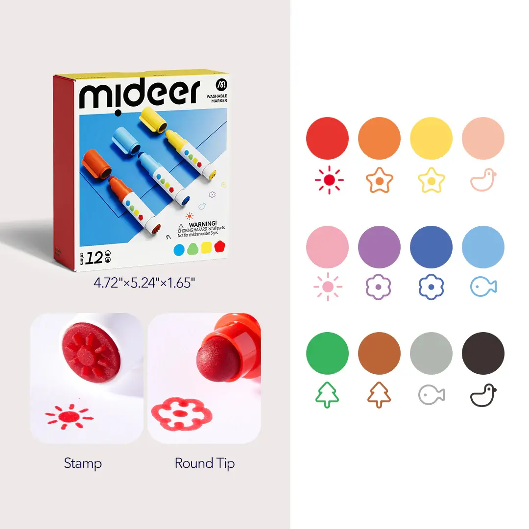Markery zmywalne z okrągłą końcówką i stemplem (12 kolorów)