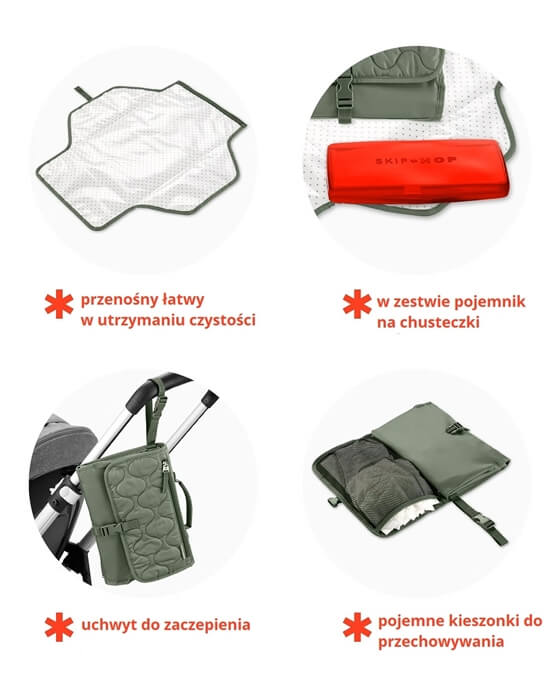 - siateczkowa kieszeń pomieści do 4 pieluch, kremy i inne niezbędne akcesoria,