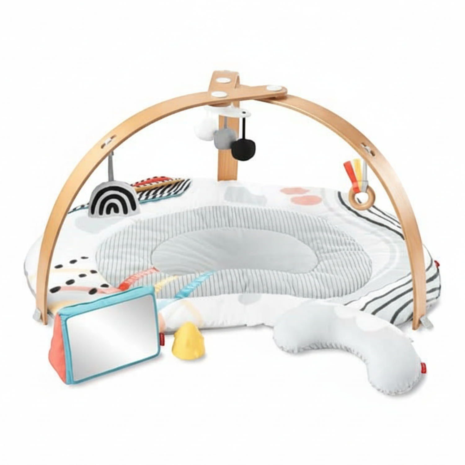 Pięć inspirowanych naturą zabawek rozwojowych, wykonane z pochodzącego ze zrównoważonych źródeł drewna łuki oraz miękka mata do zabawy tworzą piękną całość, która zapewnia rozrywkę oraz pole do rozwoju dziecka. Mata zawiera kontrastowe wzory, szeleszczące dźwięki, bezpieczne lusterko i wiele innych elementów, które zachęcają do samodzielnej aktywności i eksploracji. Sześć specjalnych kart dla rodziców poprowadzi Cię przez najważniejsze etapy zabawy na macie, dzięki czemu razem z dzieckiem będziecie mogli razem odkrywać, uczyć się i rozwijać.