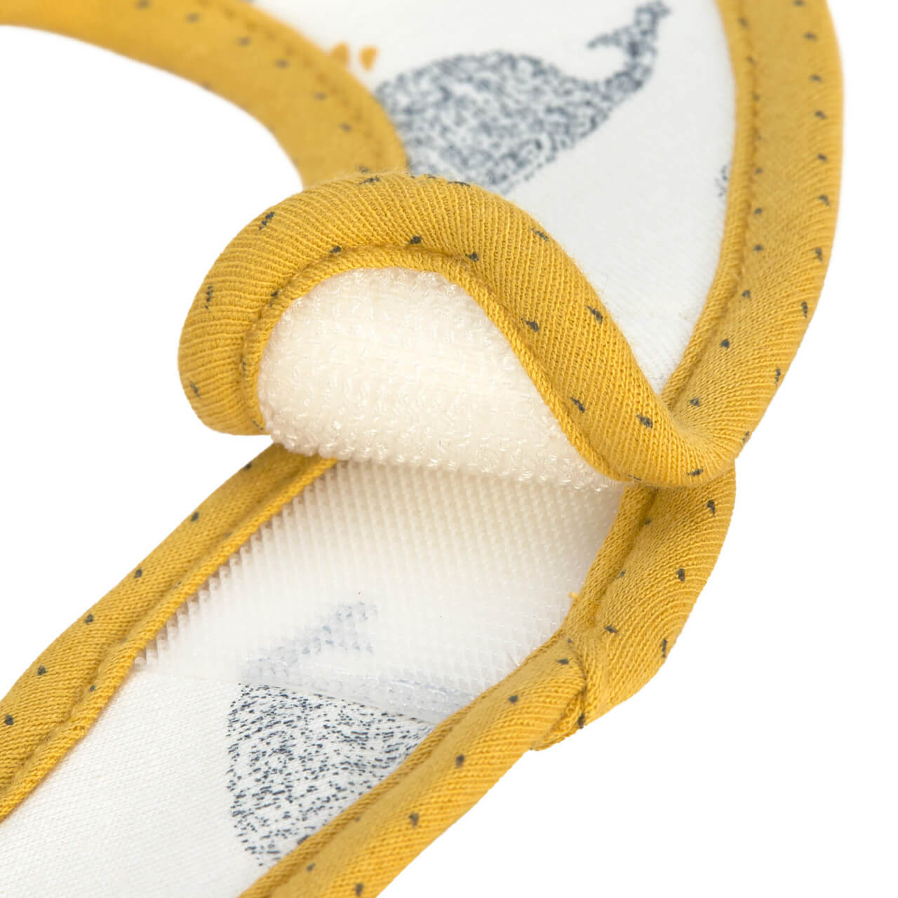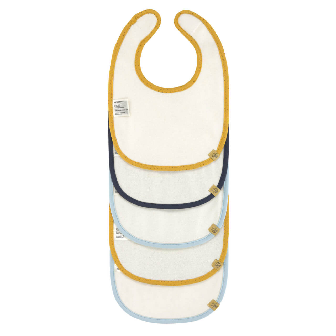 Śliniaki mają wysoki udział bawełny organicznej, dzięki czemu są łatwe w praniu i delikatne dla skóry. Wodoodporna powłoka od wewnątrz zapewnia, że koszulki i bluzki pozostają suche. Praktyczne zapięcie na rzep ułatwia zakładanie i zdejmowanie śliniaczków.